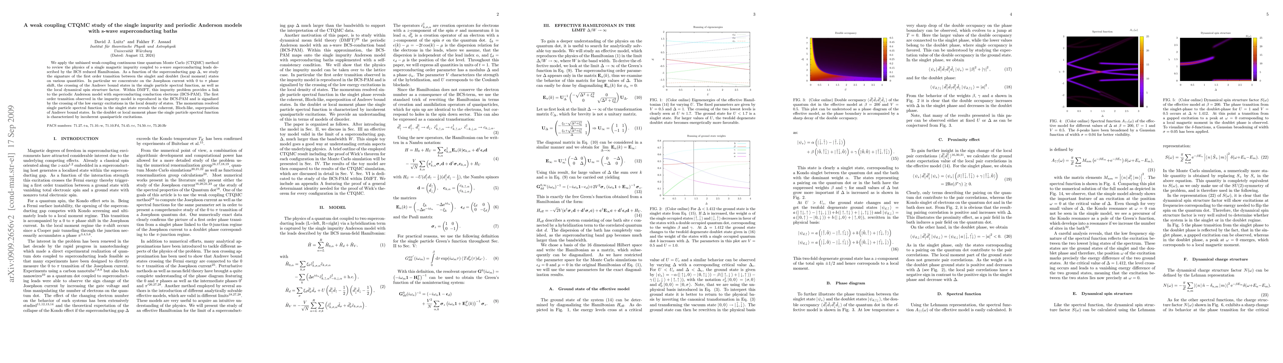 We apply the unbiased weak-coupling continuous time quantum Monte Carlo (CTQMC) method to review the physics of a single magnetic impurity coupled to s-wave superconducting leads described by the BCS reduced Hamiltonian. As a function of the superconducting gap $\Delta$, we study the signature of the first order transition between the singlet and doublet (local moment) states on various quantities. In particular we concentrate on the Josephson current with 0 to $\pi$ phase shift, the crossing of the Andreev bound states in the single particle spectral function, as well as the local dynamical spin structure factor. Within DMFT, this impurity problem provides a link to the periodic Anderson model with superconducting conduction electrons (BCS-PAM). The first order transition observed in the impurity model is reproduced in the BCS-PAM and is signalized by the crossing of the low energy excitations in the local density of states. The momentum resolved single particle spectral function in the singlet state reveals the coherent, Bloch-like, superposition of Andreev bound states. In the doublet or local moment phase the single particle spectral function is characterized by incoherent quasiparticle excitations.