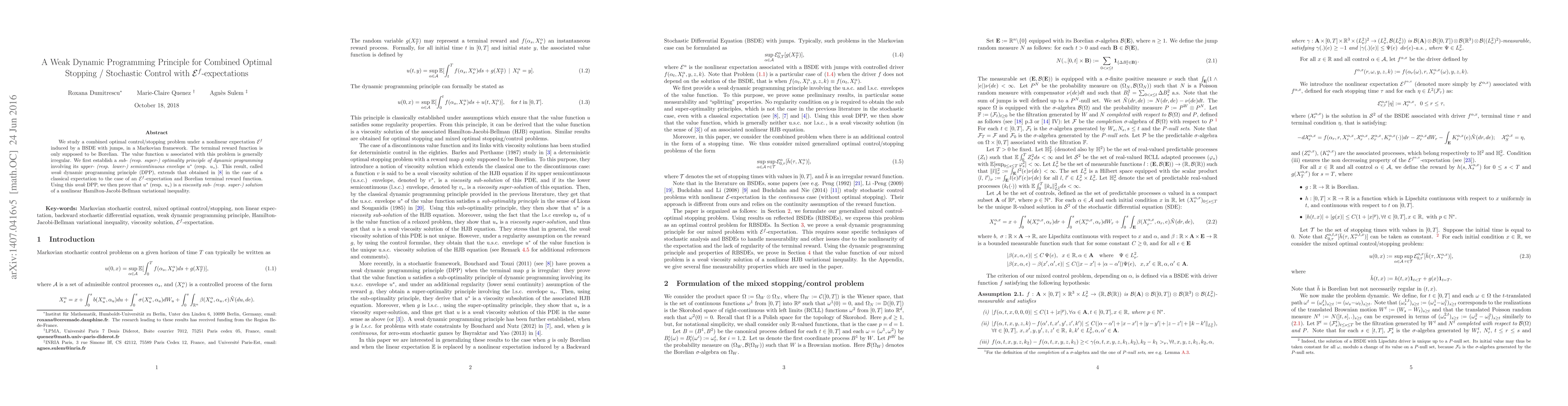 We study a combined optimal control/stopping problem under a nonlinear expectation ${\cal E}^f$ induced by a BSDE with jumps, in a Markovian framework. The terminal reward function is only supposed to be Borelian. The value function $u$ associated with this problem is generally irregular. We first establish a {\em sub- (resp. super-) optimality principle of dynamic programming} involving its {\em upper- (resp. lower-) semicontinuous envelope} $u^*$ (resp. $u_*$). This result, called {\em weak} dynamic programming principle (DPP), extends that obtained in \cite{BT} in the case of a classical expectation to the case of an ${\cal E}^f$-expectation and Borelian terminal reward function. Using this {\em weak} DPP, we then prove that $u^*$ (resp. $u_*$) is a {\em viscosity sub- (resp. super-) solution} of a nonlinear Hamilton-Jacobi-Bellman variational inequality.