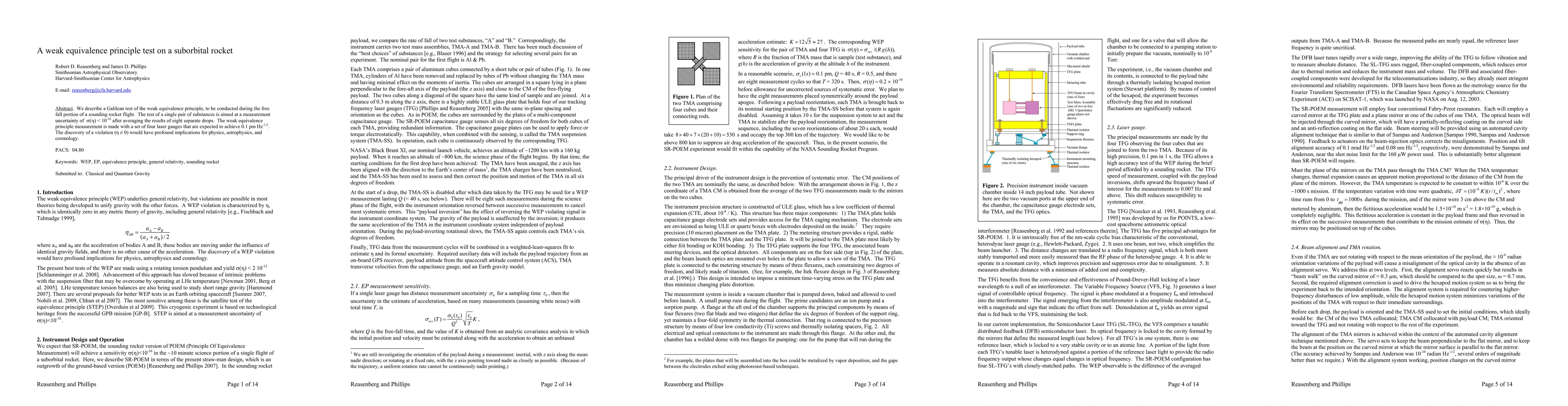 This paper details a suborbital rocket experiment designed to test the weak equivalence principle with high precision using laser gauges, aiming for a measurement uncertainty of less than 10^-16. Any detected violation would significantly impact physics, astrophysics, and cosmology.