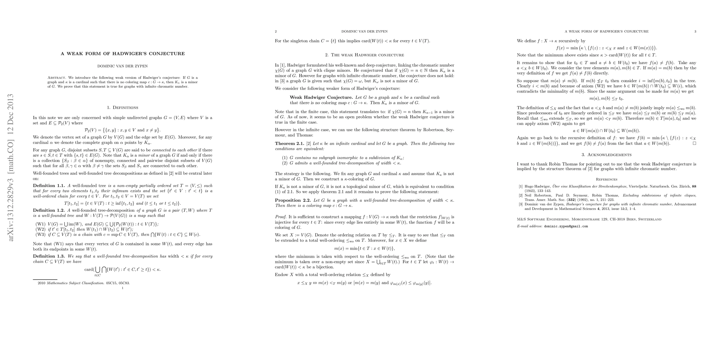 Summary: This paper proposes a weak form of Hadwiger's conjecture, asserting that if a graph cannot be colored with a finite number of colors, then a complete graph of that size is a minor of the original graph. The authors prove this weak conjecture holds for graphs with infinite chromatic number.