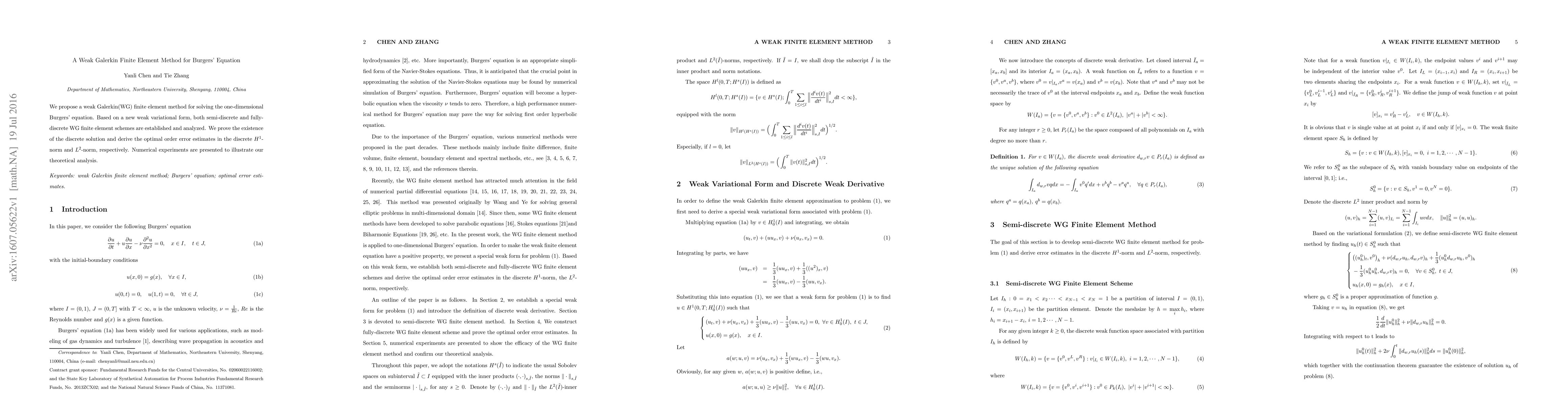 This paper introduces a weak Galerkin finite element method for solving the one-dimensional Burgers' equation, establishing both semi-discrete and fully-discrete schemes, and proving optimal error estimates. Numerical experiments validate the theoretical analysis.
