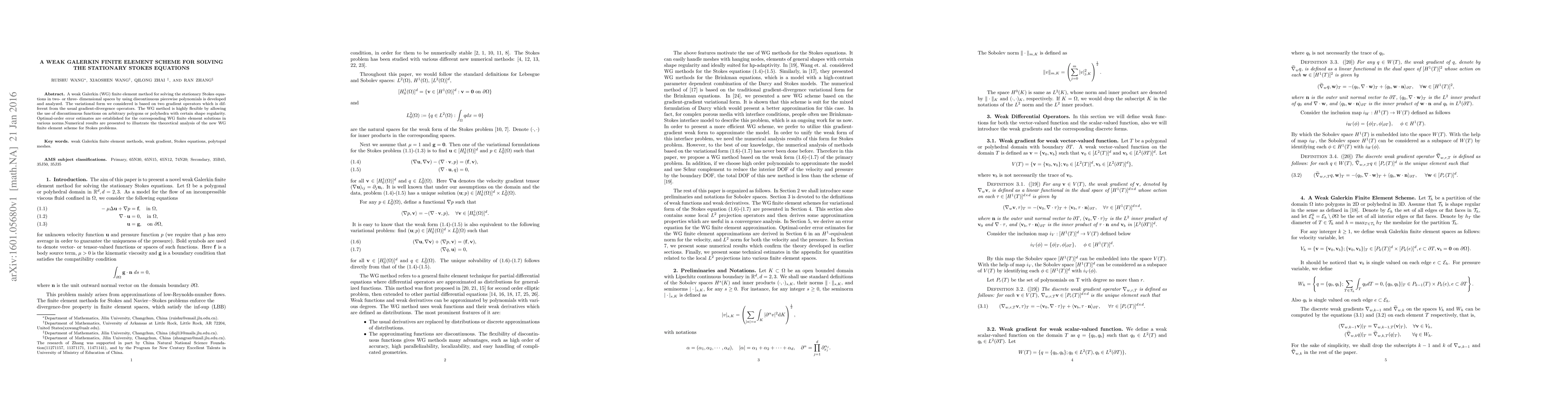 This paper develops a weak Galerkin finite element method for solving the stationary Stokes equations using discontinuous piecewise polynomials. Optimal-order error estimates are established, and numerical results validate the theoretical analysis.