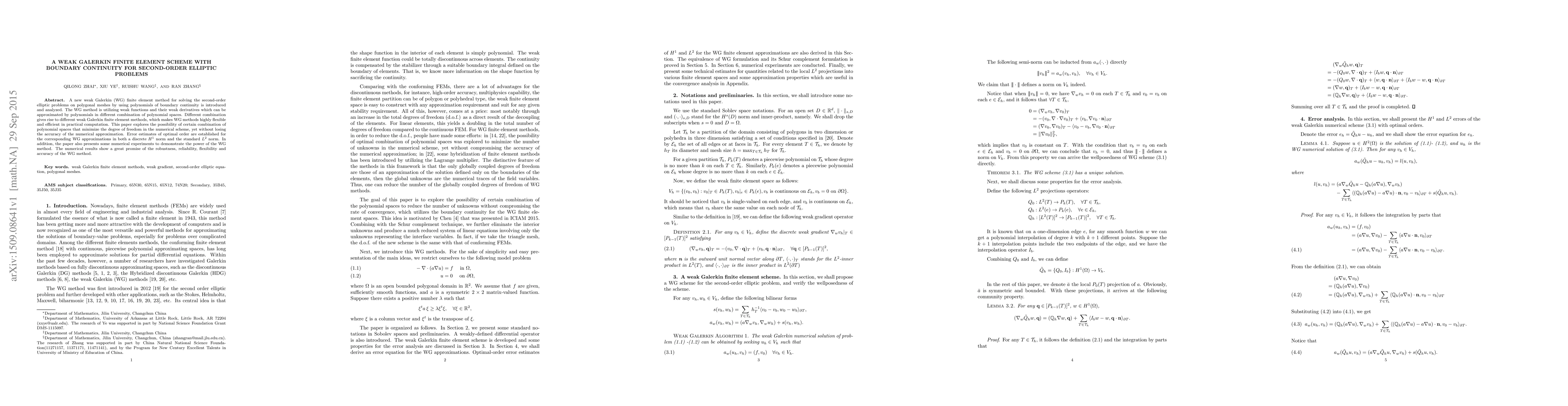 This paper introduces a new weak Galerkin finite element method for solving second-order elliptic problems on polygonal meshes, utilizing polynomials with boundary continuity. The method is shown to be flexible, efficient, and accurate, with optimal error estimates and promising numerical results.