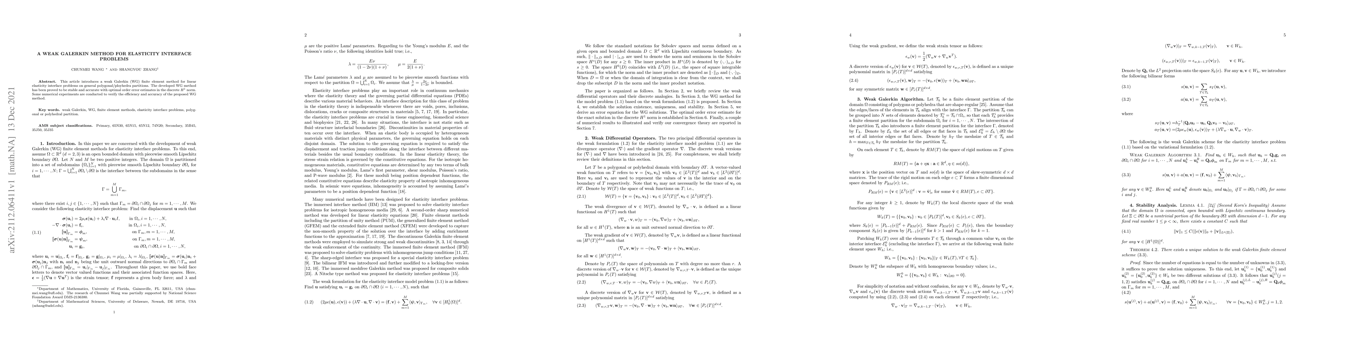 This paper presents a stable and accurate weak Galerkin finite element method for solving linear elasticity interface problems on complex partitions. Numerical experiments confirm the method's efficiency and optimal error estimates.