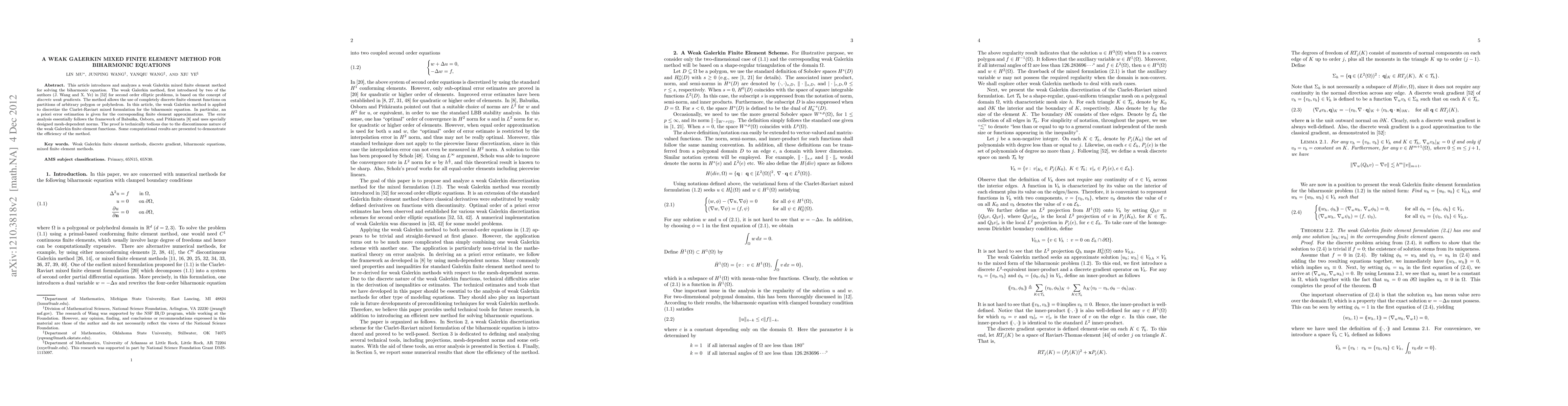 This paper develops a weak Galerkin mixed finite element method for solving biharmonic equations, providing an a priori error estimation and demonstrating its efficiency through computational results. The method utilizes discrete weak gradients and is applicable to arbitrary polygonal or polyhedral partitions.
