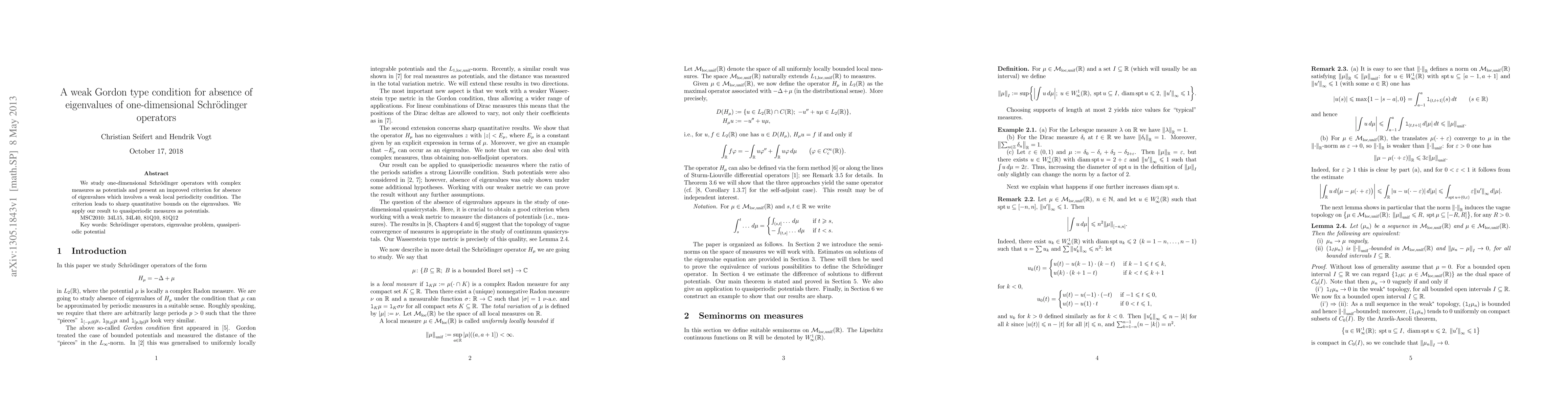 Summary: This paper presents an improved criterion for the absence of eigenvalues in one-dimensional Schrödinger operators with complex measure potentials, based on a weak local periodicity condition, and applies this to quasiperiodic measures to derive sharp bounds on eigenvalues.