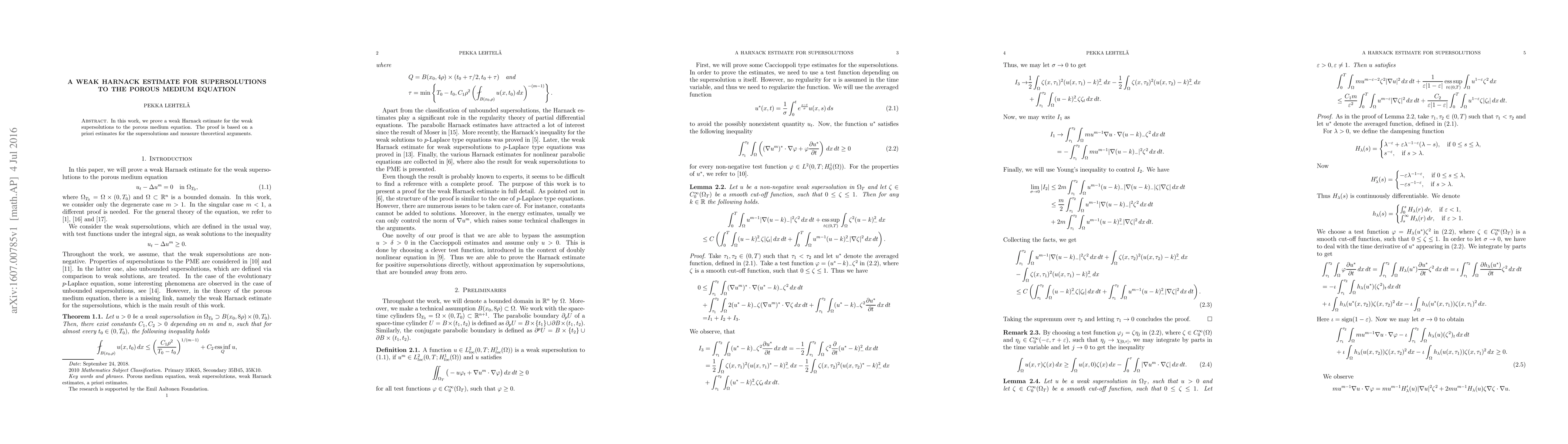 Summary: This paper establishes a weak Harnack estimate for weak supersolutions to the porous medium equation, utilizing a priori estimates and measure theoretical methods to support the proof.