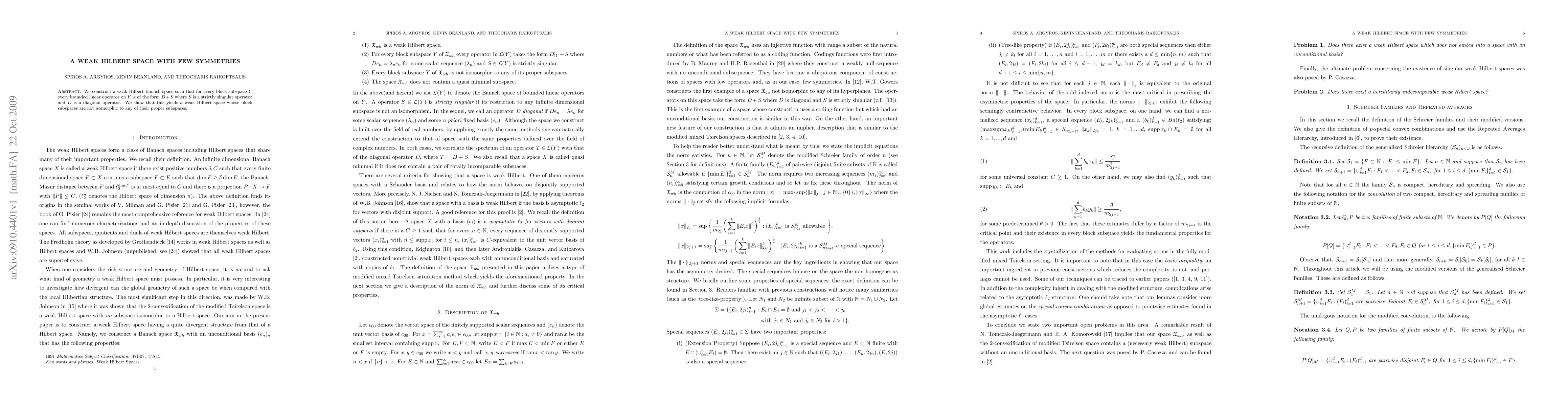 This paper constructs a weak Hilbert Banach space where every bounded linear operator on any block subspace is decomposable into a diagonal operator plus a strictly singular operator, resulting in a space with few symmetries and block subspaces that are not isomorphic to their proper subspaces.
