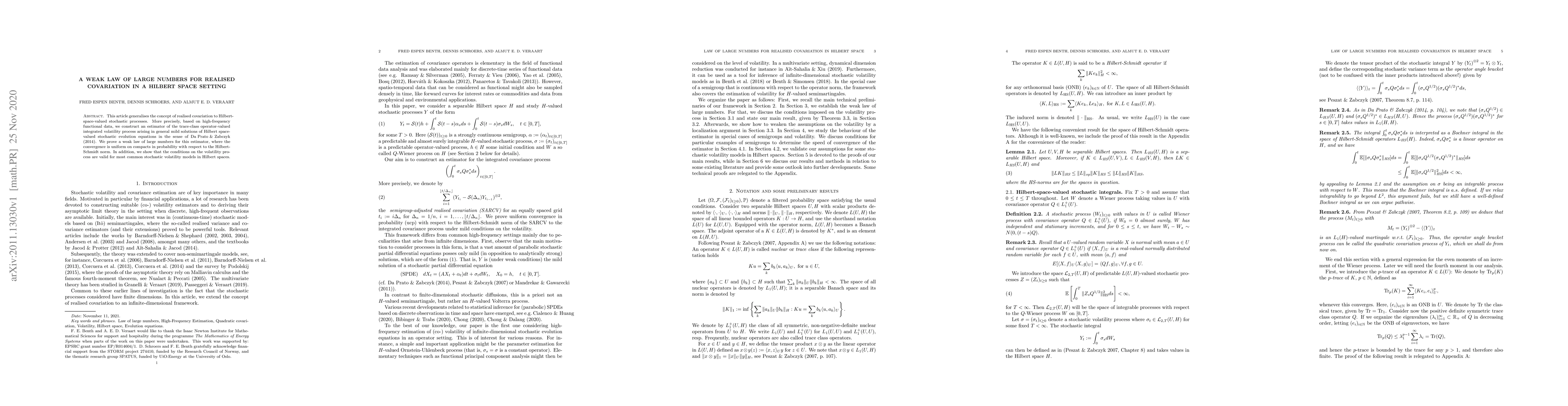 This paper generalises realised covariation to Hilbert-space-valued stochastic processes, constructing an estimator for integrated volatility. It proves a weak law of large numbers for this estimator, demonstrating uniform convergence on compacts in probability.