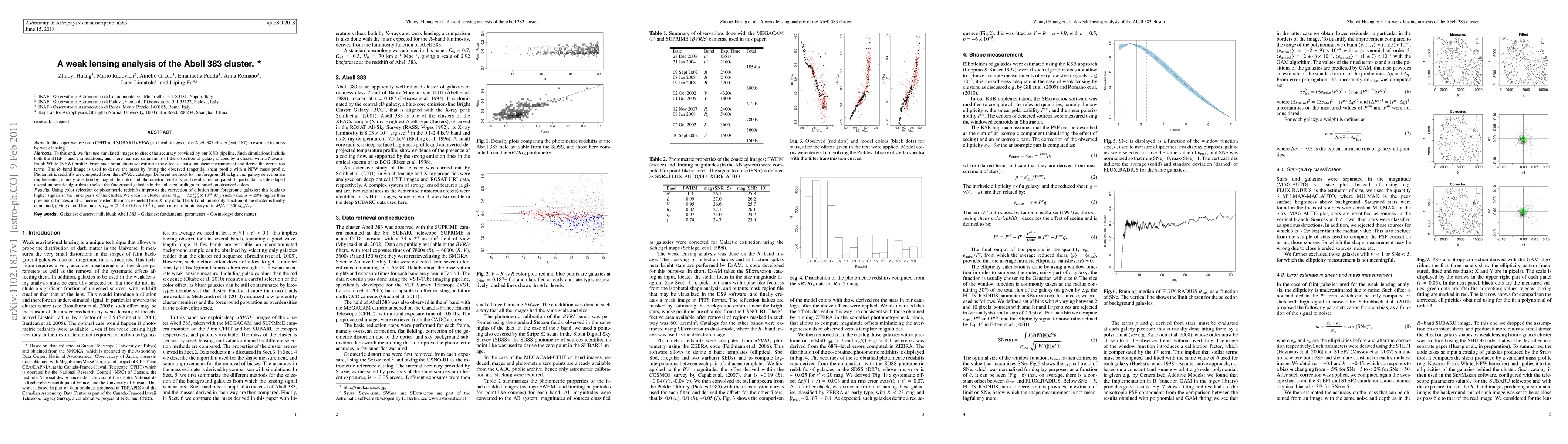 In this paper we use deep CFHT and SUBARU $uBVRIz$ archival images of the Abell 383 cluster (z=0.187) to estimate its mass by weak lensing. To this end, we first use simulated images to check the accuracy provided by our KSB pipeline. Such simulations include both the STEP 1 and 2 simulations, and more realistic simulations of the distortion of galaxy shapes by a cluster with a Navarro-Frenk-White (NFW) profile. From such simulations we estimate the effect of noise on shear measurement and derive the correction terms. The R-band image is used to derive the mass by fitting the observed tangential shear profile with a NFW mass profile. Photometric redshifts are computed from the uBVRIz catalogs. Different methods for the foreground/background galaxy selection are implemented, namely selection by magnitude, color and photometric redshifts, and results are compared. In particular, we developed a semi-automatic algorithm to select the foreground galaxies in the color-color diagram, based on observed colors. Using color selection or photometric redshifts improves the correction of dilution from foreground galaxies: this leads to higher signals in the inner parts of the cluster. We obtain a cluster mass that is ~ 20% higher than previous estimates, and is more consistent the mass expected from X--ray data. The R-band luminosity function of the cluster is finally computed.