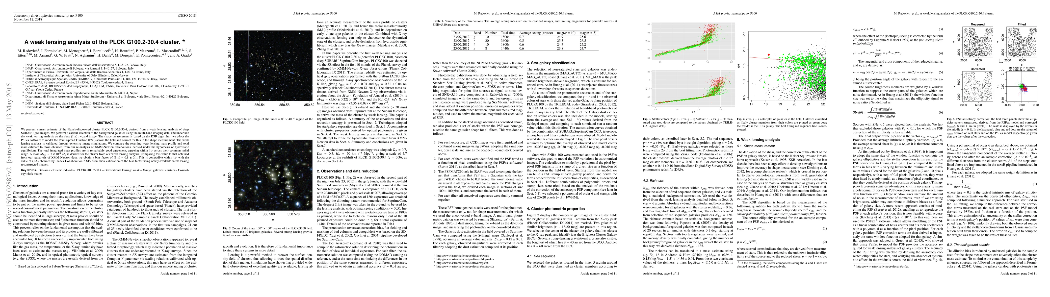 We present a mass estimate of the Planck-discovered cluster PLCK G100.2-30.4, derived from a weak lensing analysis of deep SUBARU griz images. We perform a careful selection of the background galaxies using the multi-band imaging data, and undertake the weak lensing analysis on the deep (1hr) r-band image. The shape measurement is based on the KSB algorithm; we adopt the PSFex software to model the Point Spread Function (PSF) across the field and correct for this in the shape measurement. The weak lensing analysis is validated through extensive image simulations. We compare the resulting weak lensing mass profile and total mass estimate to those obtained from our re-analysis of XMM-Newton observations, derived under the hypothesis of hydrostatic equilibrium. The total integrated mass profiles are in remarkably good agreement, agreeing within 1$\sigma$ across their common radial range. A mass $M_{500} \sim 7 \times 10^{14} M_\odot$ is derived for the cluster from our weak lensing analysis. Comparing this value to that obtained from our reanalysis of XMM-Newton data, we obtain a bias factor of (1-b) = 0.8 $\pm$ 0.1. This is compatible within 1$\sigma$ with the value of (1-b) obtained by Planck Collaboration XXIV from their calibration of the bias factor using newly-available weak lensing reconstructed masses.