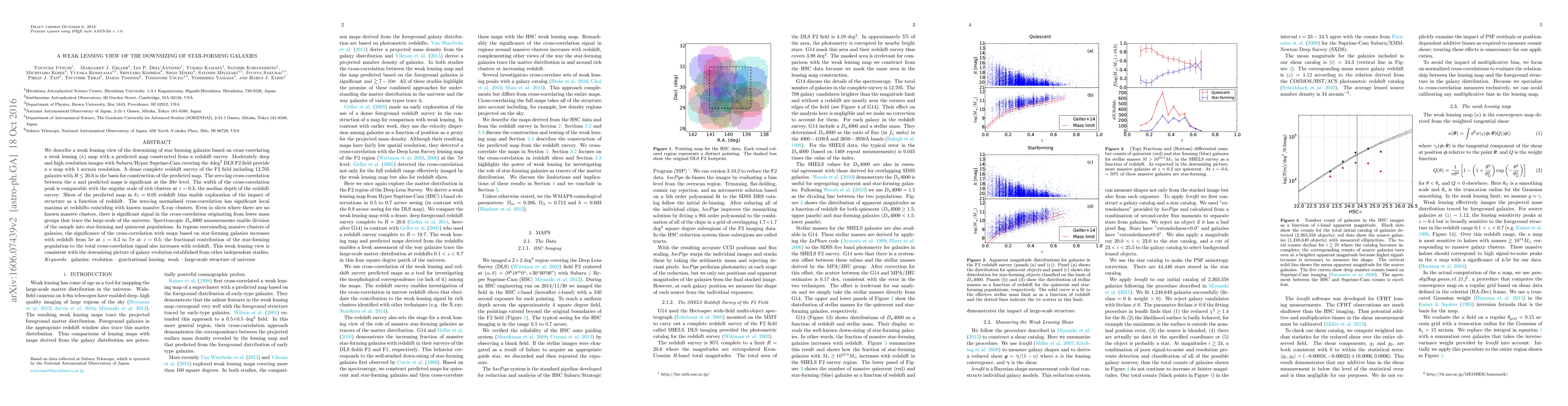 We describe a weak lensing view of the downsizing of star forming galaxies based on cross correlating a weak lensing ($\kappa$) map with a predicted map constructed from a redshift survey. Moderately deep and high resolution images with Subaru/Hyper Suprime-Cam covering the 4 deg^2 DLS F2 field provide a $\kappa$ map with 1 arcmin resolution. A dense complete redshift survey of the F2 field including 12,705 galaxies with $R\leq20.6$ is the basis for construction of the predicted map. The zero-lag cross-correlation between the \kappa and predicted maps is significant at the $30\sigma$ level. The width of the cross-correlation peak is comparable with the angular scale of rich cluster at $z\sim0.3$, the median depth of the redshift survey. Slices of the predicted map in $\delta{z} = 0.05$ redshift bins enable exploration of the impact of structure as a function of redshift. The zero-lag normalised cross-correlation has significant local maxima at redshifts coinciding with known massive X-ray clusters. Even in slices where there are no known massive clusters, there is significant signal in the cross-correlation originating from lower mass groups that trace the large-scale of the universe. Spectroscopic $D_n4000$ measurements enable division of the sample into star-forming and quiescent populations. The significance of the cross-correlation with structure containing star-forming galaxies increases with redshift from $5\sigma$ at $z = 0.3$ to $7 \sigma$ at $z = 0.5$. The weak lensing results are consistent with the downsizing view of galaxy evolution established on the basis of many other independent studies.