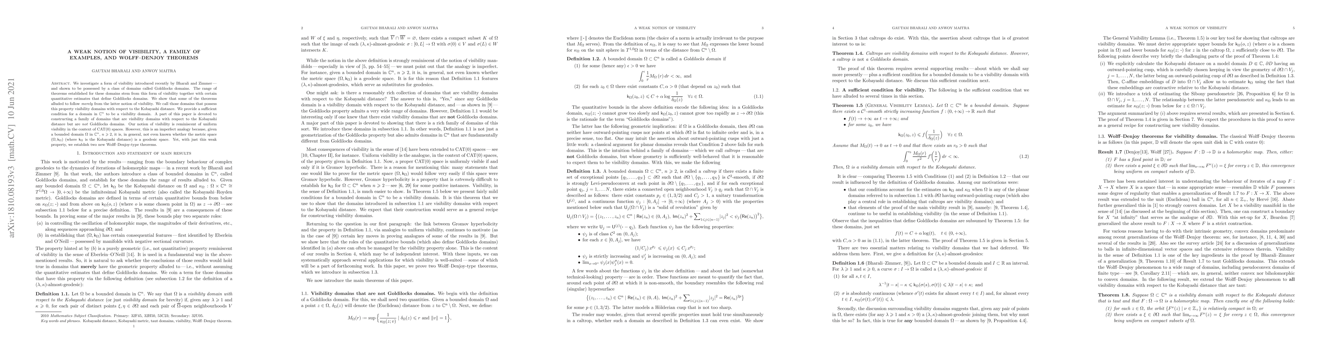 We investigate a form of visibility introduced recently by Bharali and Zimmer -- and shown to be possessed by a class of domains called Goldilocks domains. The range of theorems established for these domains stem from this form of visibility together with certain quantitative estimates that define Goldilocks domains. We show that some of the theorems alluded to follow merely from the latter notion of visibility. We call those domains that possess this property visibility domains with respect to the Kobayashi distance. We provide a sufficient condition for a domain in $\mathbb{C}^n$ to be a visibility domain. A part of this paper is devoted to constructing a family of domains that are visibility domains with respect to the Kobayashi distance but are not Goldilocks domains. Our notion of visibility is reminiscent of uniform visibility in the context of CAT(0) spaces. However, this is an imperfect analogy because, given a bounded domain $\Omega$ in $\mathbb{C}^n$, $n\geq 2$, it is, in general, not even known whether the metric space $(\Omega,{\sf k}_{\Omega})$ (where ${\sf k}_{\Omega}$ is the Kobayashi distance) is a geodesic space. Yet, with just this weak property, we establish two Wolff--Denjoy-type theorems.