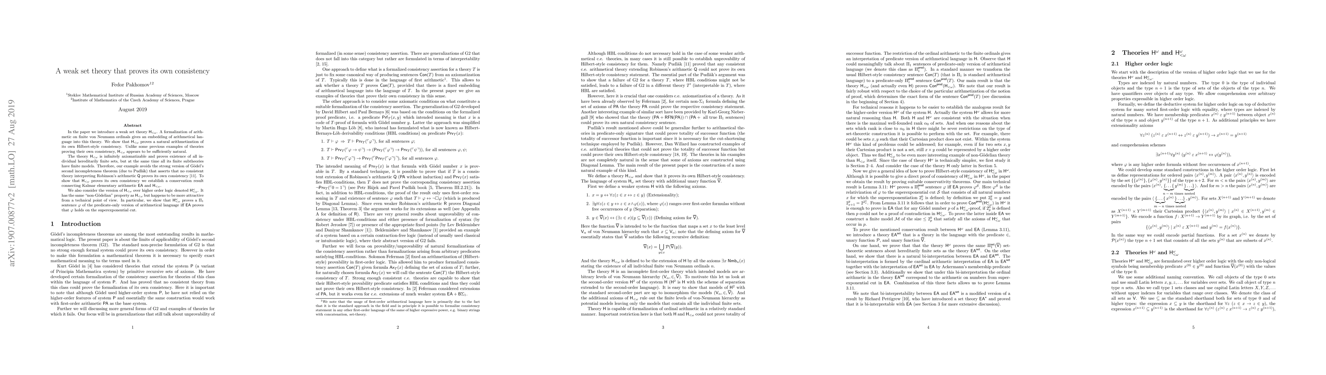 This paper introduces a weak set theory $\mathsf{H}_{<\omega}$ that proves its own consistency, avoiding Gödel's second incompleteness theorem. It establishes a conservation result linking $\mathsf{H}_{<\omega}$ to Kalmar elementary arithmetic $\mathsf{EA}$ and explores a higher-order version $\mathsf{H}^{\omega}_{<\omega}$ with similar properties.