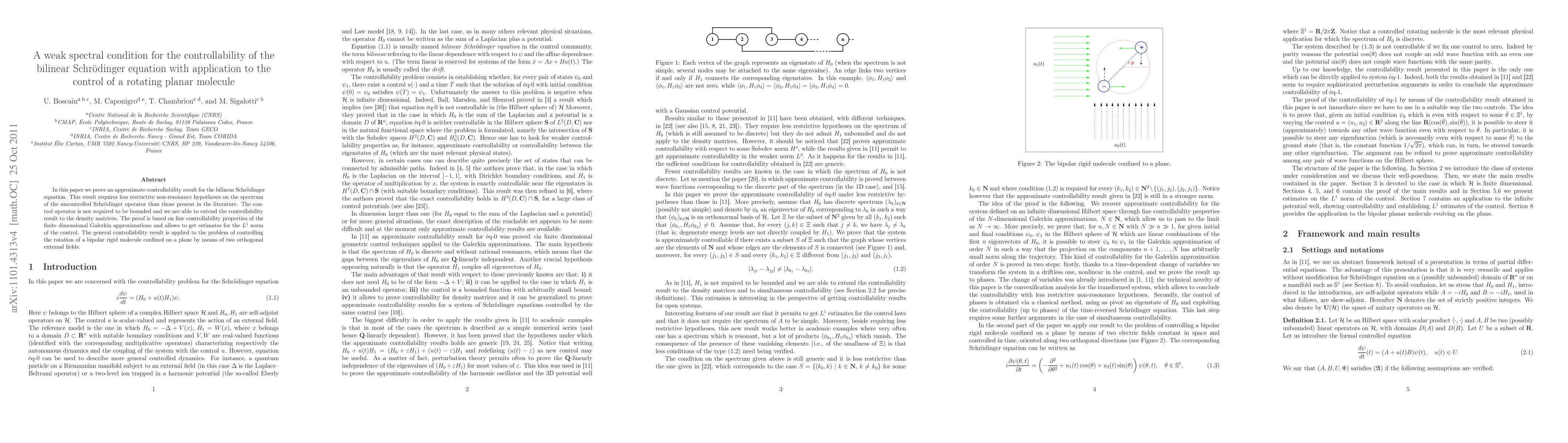 This paper establishes an approximate controllability result for the bilinear Schrödinger equation with less restrictive spectral conditions, extending controllability to density matrices. The method is applied to control the rotation of a planar bipolar rigid molecule using two orthogonal external fields.