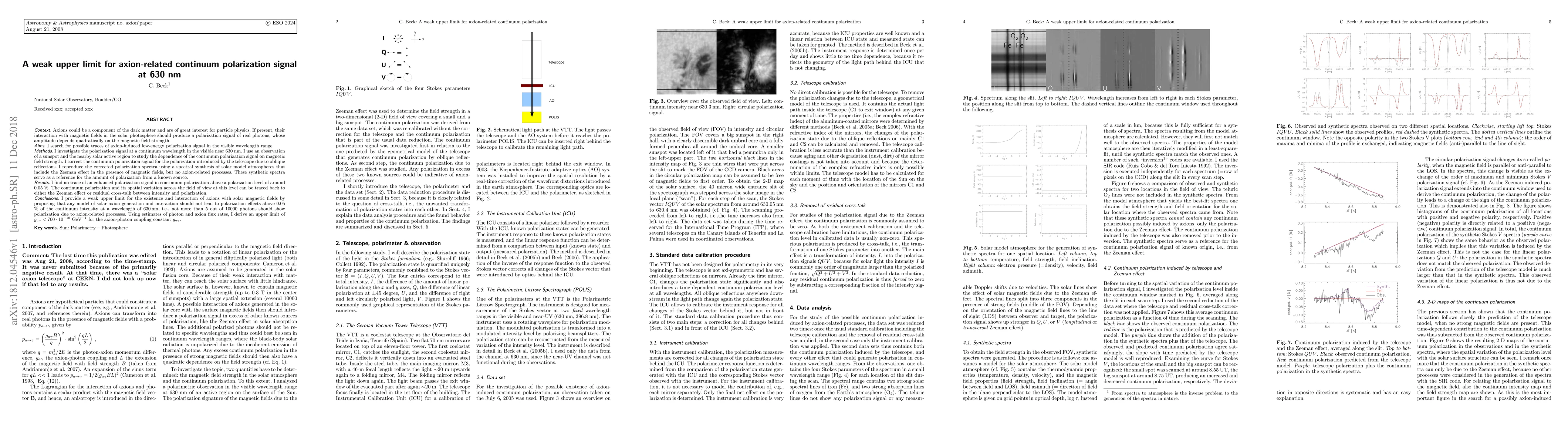 Axions could be a component of the dark matter and are of great interest for particle physics. If present, their interaction with magnetic fields in the solar photosphere should produce a polarization signal of real photons, whose amplitude depends quadratically on the magnetic field strength. I search for possible traces of axion-induced low-energy polarization signal in the visible wavelength range near 630 nm. I use an observation of a sunspot and the nearby active region to study the dependence of the continuum polarization signal on magnetic field strength. I correct the continuum polarization signal for the polarization introduced by the telescope due to oblique reflections. I reproduce the corrected polarization spectra using a spectral synthesis of solar model atmospheres that include the Zeeman effect. These synthetic spectra serve as a reference for the amount of polarization from a known source. I find no trace of an enhanced polarization signal in continuum polarization above a polarization level of around 0.05 % of I_c. I provide a weak upper limit for the existence and interaction of axions with solar magnetic fields by proposing that any model of solar axion generation and interaction should not lead to polarization effects above 0.05 % of the continuum intensity at a wavelength of 630 nm, i.e., not more than 5 out of 10000 photons should show polarization due to axion-related processes. Using estimates of photon and axion flux rates, I derive an upper limit of $g_{a\gamma} < 700*10^{-10}$ GeV$^{-1}$ for the axion-photon coupling constant $g_{a\gamma}$.