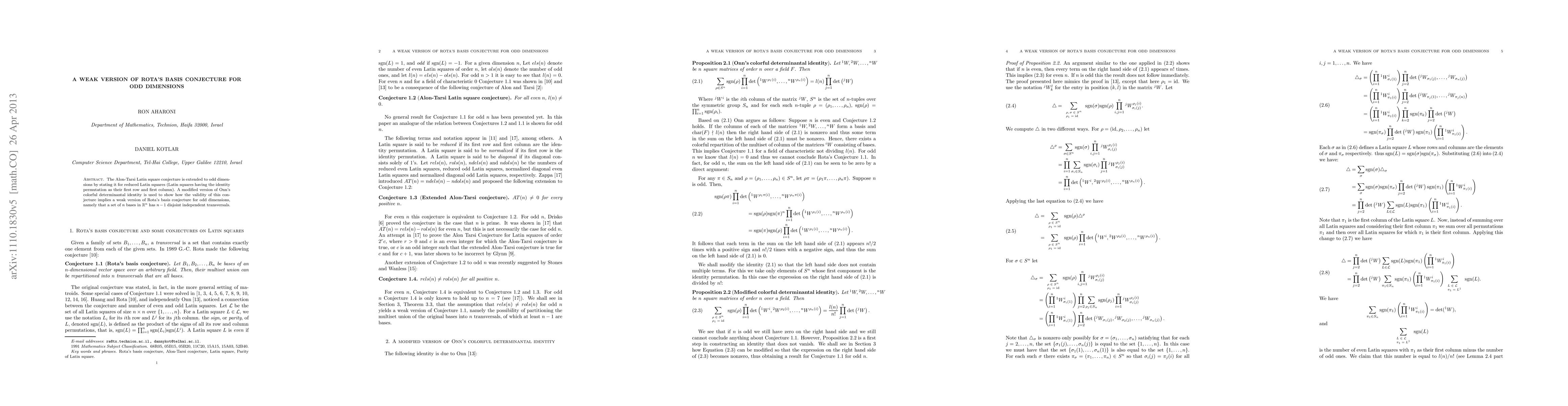 Researchers prove a weak version of Rota's basis conjecture for odd dimensions by extending the Alon-Tarsi Latin square conjecture to reduced Latin squares in odd dimensions.