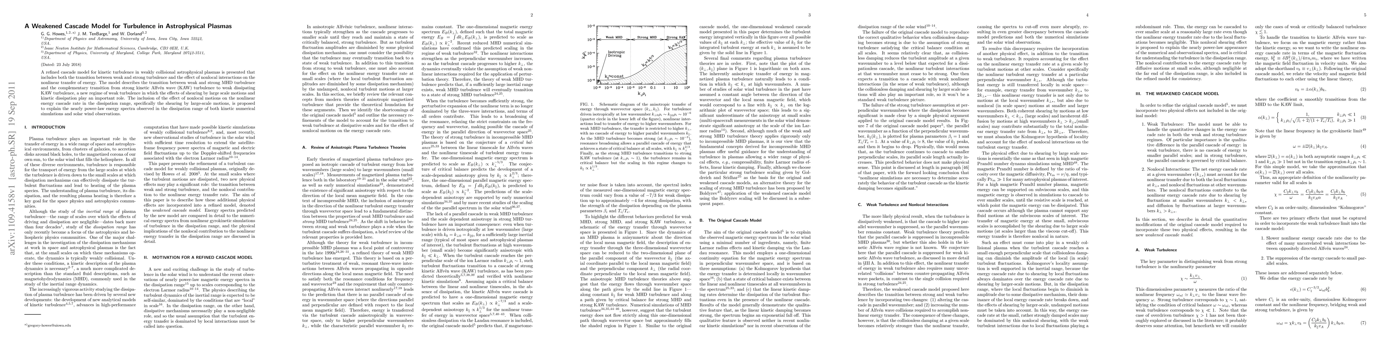 This paper presents a refined cascade model for kinetic turbulence in weakly collisional astrophysical plasmas, focusing on the transition between weak and strong turbulence and the impact of nonlocal interactions on energy transfer. It introduces a new regime of weak turbulence where shearing and kinetic dissipation are significant, explaining observed power-law energy spectra in solar wind observations.