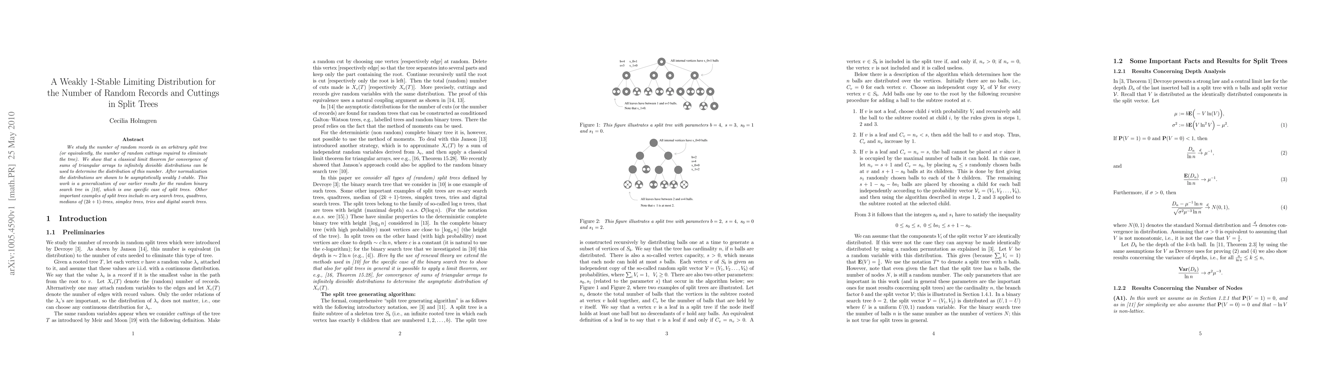 We study the number of random records in an arbitrary split tree (or equivalently, the number of random cuttings required to eliminate the tree). We show that a classical limit theorem for convergence of sums of triangular arrays to infinitely divisible distributions can be used to determine the distribution of this number. After normalization the distributions are shown to be asymptotically weakly 1-stable. This work is a generalization of our earlier results for the random binary search tree, which is one specific case of split trees. Other important examples of split trees include $m$-ary search trees, quadtrees, medians of $(2k+1)$-trees, simplex trees, tries and digital search trees.