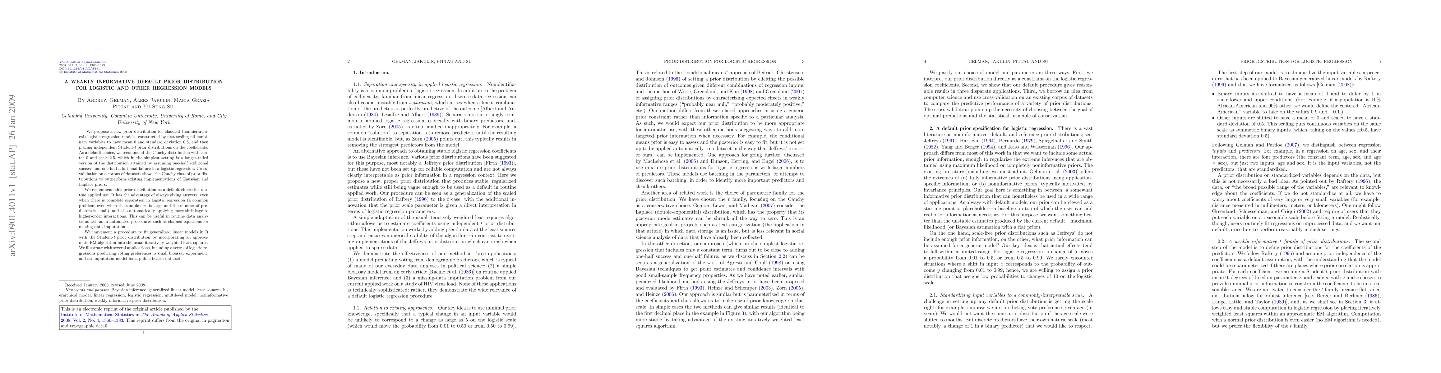 We propose a new prior distribution for classical (nonhierarchical) logistic regression models, constructed by first scaling all nonbinary variables to have mean 0 and standard deviation 0.5, and then placing independent Student-$t$ prior distributions on the coefficients. As a default choice, we recommend the Cauchy distribution with center 0 and scale 2.5, which in the simplest setting is a longer-tailed version of the distribution attained by assuming one-half additional success and one-half additional failure in a logistic regression. Cross-validation on a corpus of datasets shows the Cauchy class of prior distributions to outperform existing implementations of Gaussian and Laplace priors. We recommend this prior distribution as a default choice for routine applied use. It has the advantage of always giving answers, even when there is complete separation in logistic regression (a common problem, even when the sample size is large and the number of predictors is small), and also automatically applying more shrinkage to higher-order interactions. This can be useful in routine data analysis as well as in automated procedures such as chained equations for missing-data imputation. We implement a procedure to fit generalized linear models in R with the Student-$t$ prior distribution by incorporating an approximate EM algorithm into the usual iteratively weighted least squares. We illustrate with several applications, including a series of logistic regressions predicting voting preferences, a small bioassay experiment, and an imputation model for a public health data set.