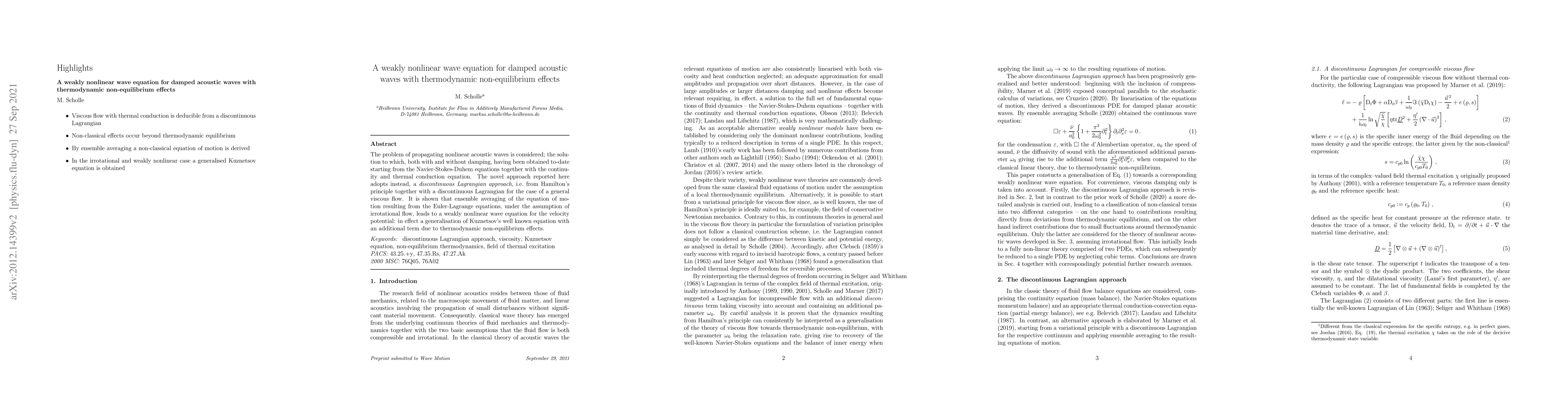 The problem of propagating nonlinear acoustic waves is considered; the solution to which, both with and without damping, having been obtained to-date starting from the Navier-Stokes-Duhem equations together with the continuity and thermal conduction equation. The novel approach reported here adopts instead, a discontinuous Lagrangian approach, i.e. from Hamilton's principle together with a discontinuous Lagrangian for the case of a general viscous flow. It is shown that ensemble averaging of the equation of motion resulting from the Euler-Lagrange equations, under the assumption of irrotational flow, leads to a weakly nonlinear wave equation for the velocity potential: in effect a generalisation of Kuznetsov's well known equation with an additional term due to thermodynamic non-equilibrium effects.