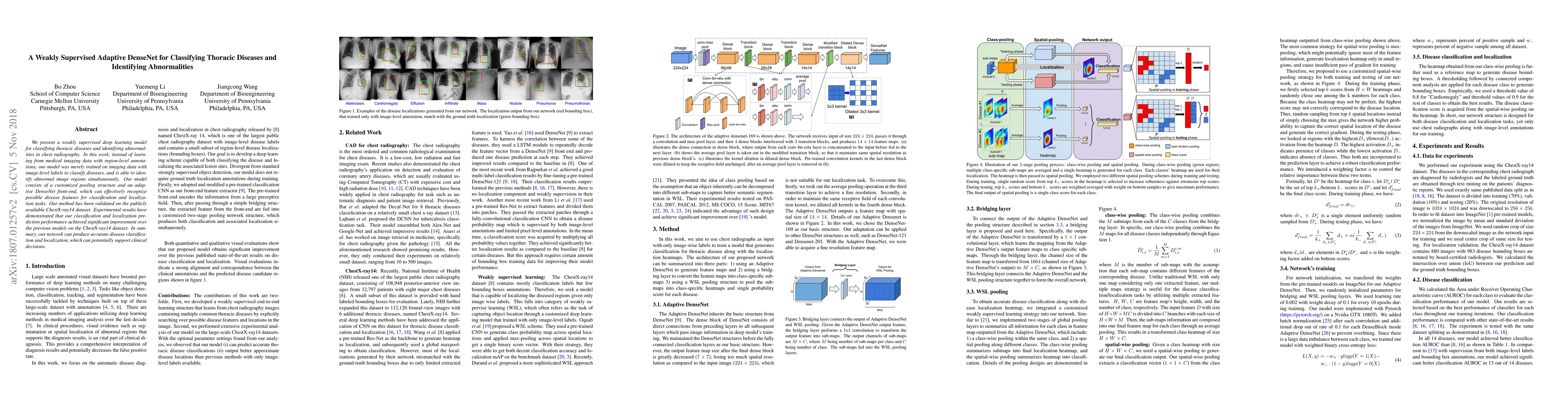 This paper introduces a weakly supervised adaptive DenseNet model for classifying thoracic diseases and identifying abnormalities in chest radiographs using only image-level labels, achieving significant improvements in both classification and localization tasks over previous models on the ChestX-ray14 dataset.