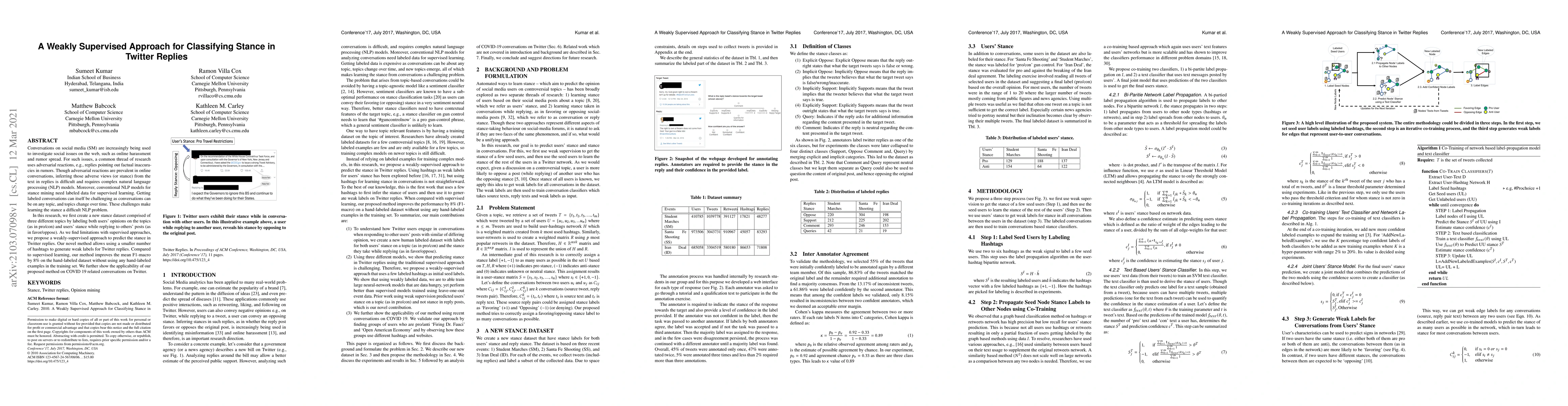 This research introduces a weakly-supervised approach to classify stance in Twitter replies, addressing the challenge of limited labeled data for supervised learning. The authors propose a method that uses a smaller number of hashtags to generate weak labels, improving mean F1-macro by 8% compared to supervised learning on a newly created dataset.