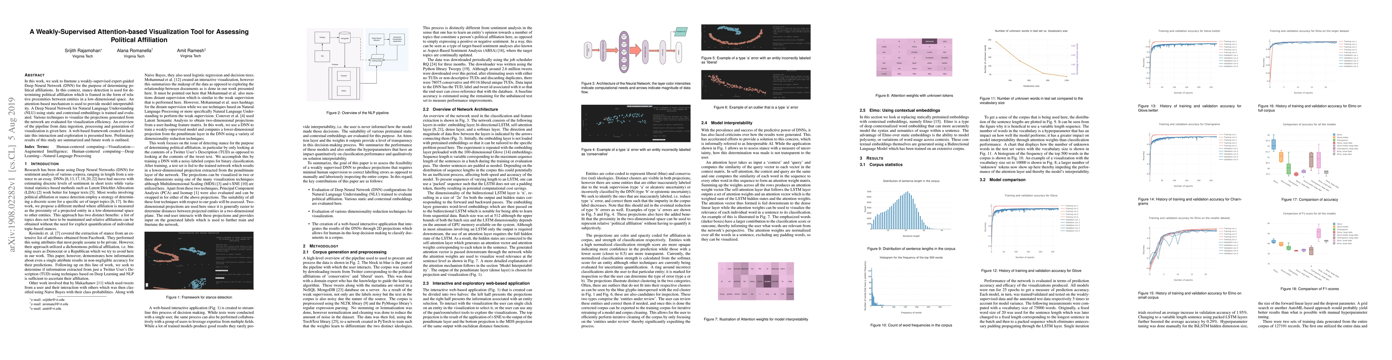 This paper presents a weakly-supervised DNN for determining political affiliations through stance detection, employing an attention-based mechanism for interpretability. The study evaluates visualization techniques and provides a web-based framework for interaction, with preliminary results and future directions outlined.