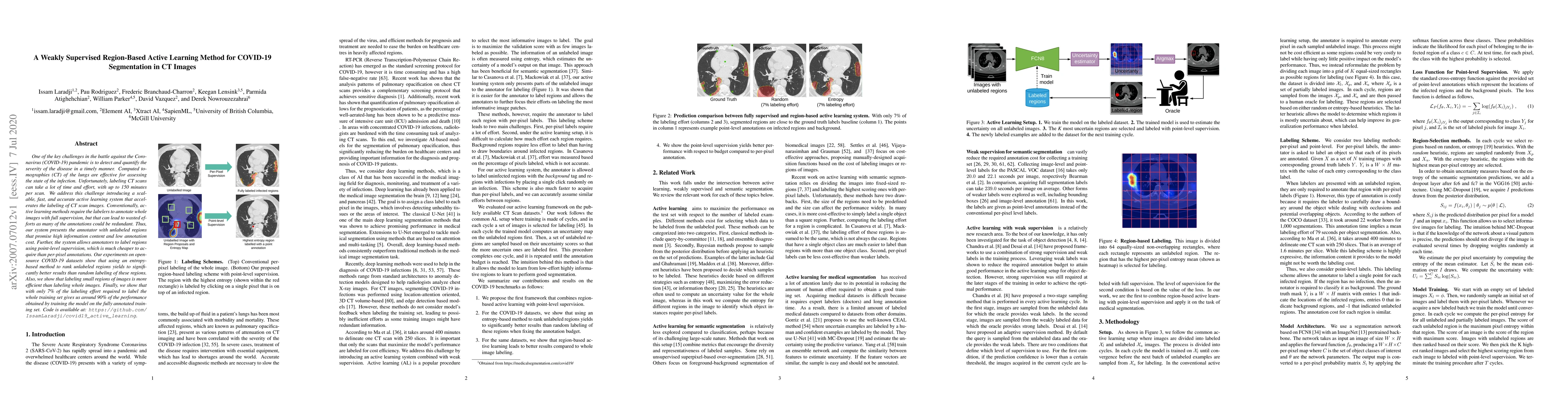 One of the key challenges in the battle against the Coronavirus (COVID-19) pandemic is to detect and quantify the severity of the disease in a timely manner. Computed tomographies (CT) of the lungs are effective for assessing the state of the infection. Unfortunately, labeling CT scans can take a lot of time and effort, with up to 150 minutes per scan. We address this challenge introducing a scalable, fast, and accurate active learning system that accelerates the labeling of CT scan images. Conventionally, active learning methods require the labelers to annotate whole images with full supervision, but that can lead to wasted efforts as many of the annotations could be redundant. Thus, our system presents the annotator with unlabeled regions that promise high information content and low annotation cost. Further, the system allows annotators to label regions using point-level supervision, which is much cheaper to acquire than per-pixel annotations. Our experiments on open-source COVID-19 datasets show that using an entropy-based method to rank unlabeled regions yields to significantly better results than random labeling of these regions. Also, we show that labeling small regions of images is more efficient than labeling whole images. Finally, we show that with only 7\% of the labeling effort required to label the whole training set gives us around 90\% of the performance obtained by training the model on the fully annotated training set. Code is available at: \url{https://github.com/IssamLaradji/covid19_active_learning}.