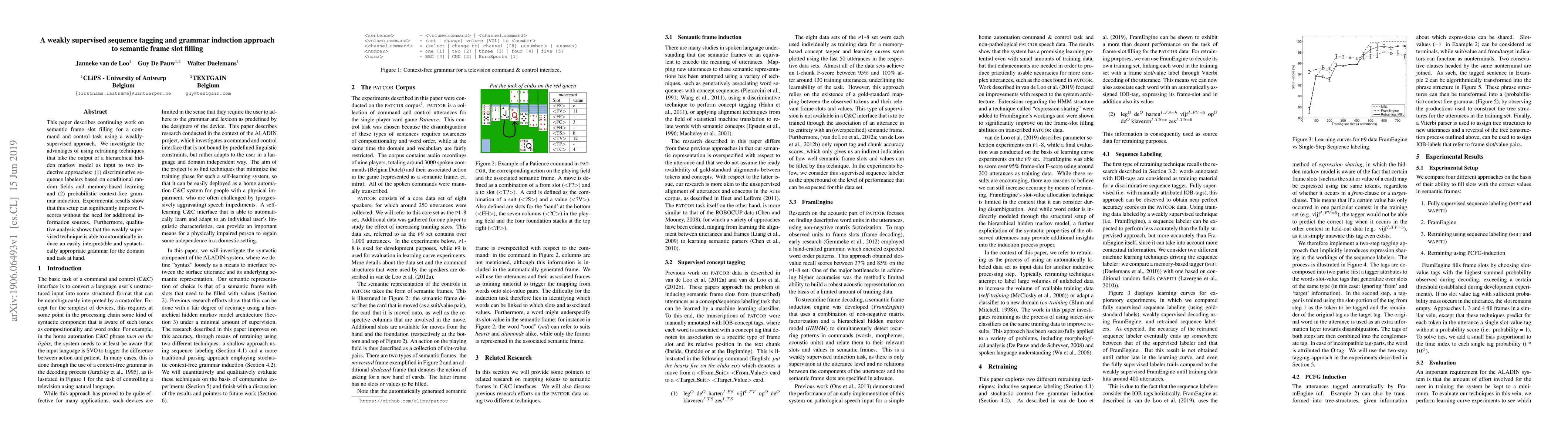 This paper proposes a weakly supervised method for semantic frame slot filling using retraining techniques with a hierarchical hidden Markov model, combining discriminative sequence labelers and probabilistic context-free grammar induction to improve F-scores. The approach demonstrates the ability to automatically induce an interpretable grammar without additional information sources.