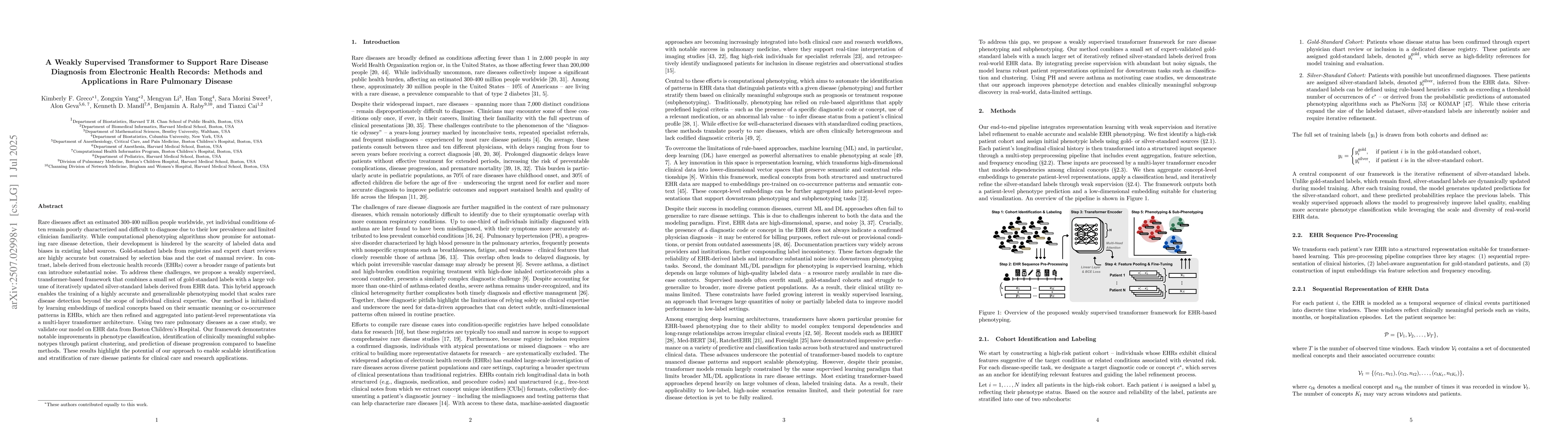 Rare diseases affect an estimated 300-400 million people worldwide, yet individual conditions often remain poorly characterized and difficult to diagnose due to their low prevalence and limited clinician familiarity. While computational phenotyping algorithms show promise for automating rare disease detection, their development is hindered by the scarcity of labeled data and biases in existing label sources. Gold-standard labels from registries and expert chart reviews are highly accurate but constrained by selection bias and the cost of manual review. In contrast, labels derived from electronic health records (EHRs) cover a broader range of patients but can introduce substantial noise. To address these challenges, we propose a weakly supervised, transformer-based framework that combines a small set of gold-standard labels with a large volume of iteratively updated silver-standard labels derived from EHR data. This hybrid approach enables the training of a highly accurate and generalizable phenotyping model that scales rare disease detection beyond the scope of individual clinical expertise. Our method is initialized by learning embeddings of medical concepts based on their semantic meaning or co-occurrence patterns in EHRs, which are then refined and aggregated into patient-level representations via a multi-layer transformer architecture. Using two rare pulmonary diseases as a case study, we validate our model on EHR data from Boston Children's Hospital. Our framework demonstrates notable improvements in phenotype classification, identification of clinically meaningful subphenotypes through patient clustering, and prediction of disease progression compared to baseline methods. These results highlight the potential of our approach to enable scalable identification and stratification of rare disease patients for clinical care and research applications.