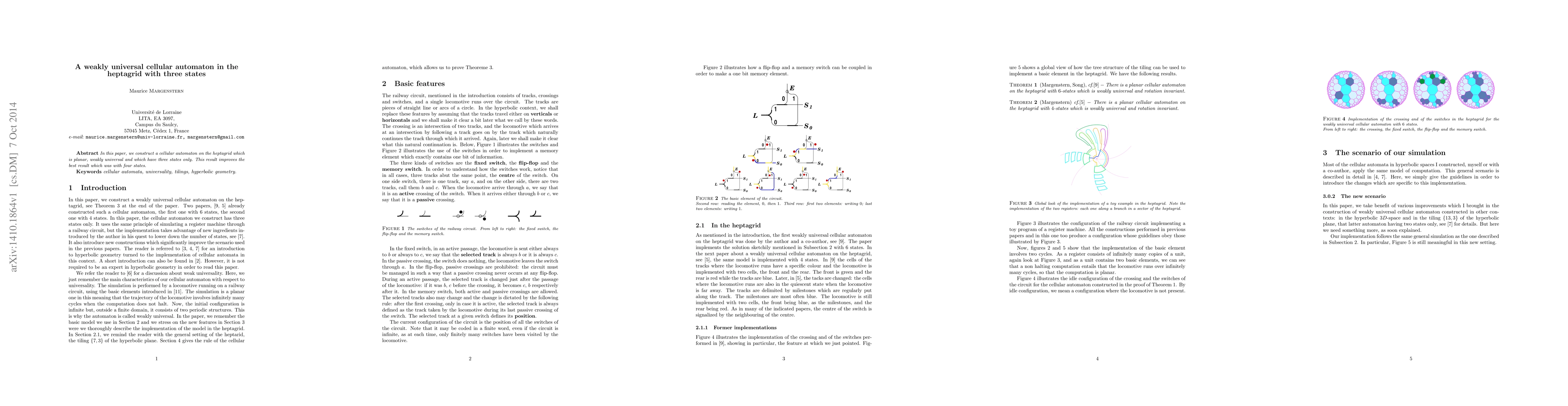 Summary: This paper presents a planar cellular automaton on the heptagrid with just three states that achieves weak universality, surpassing previous results that required four states.