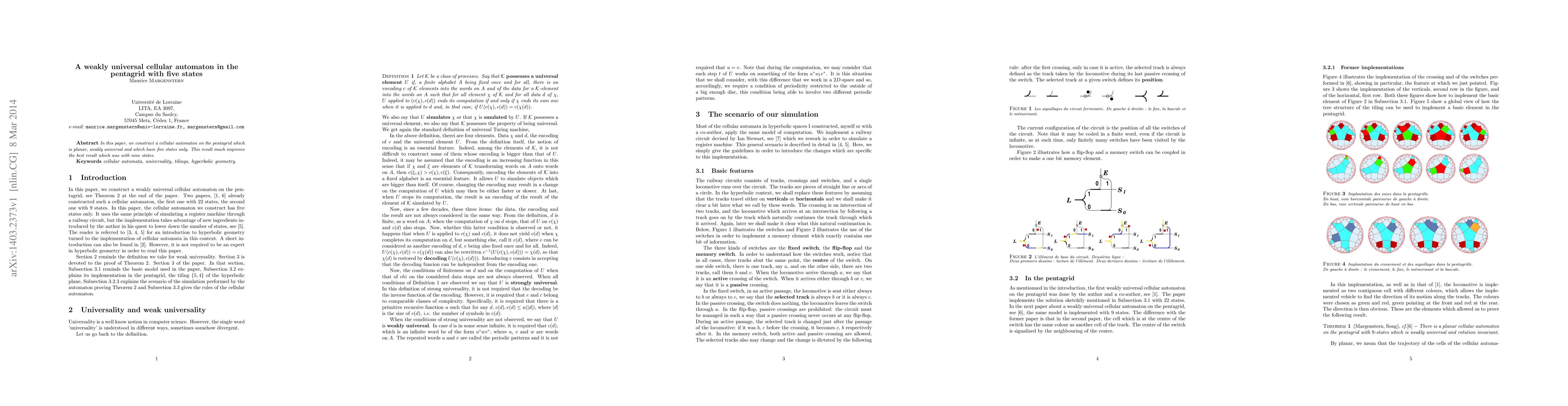 In this paper, we construct a cellular automaton on the pentagrid which is planar, weakly universal and which have five states only. This result much improves the best result which was with nine states