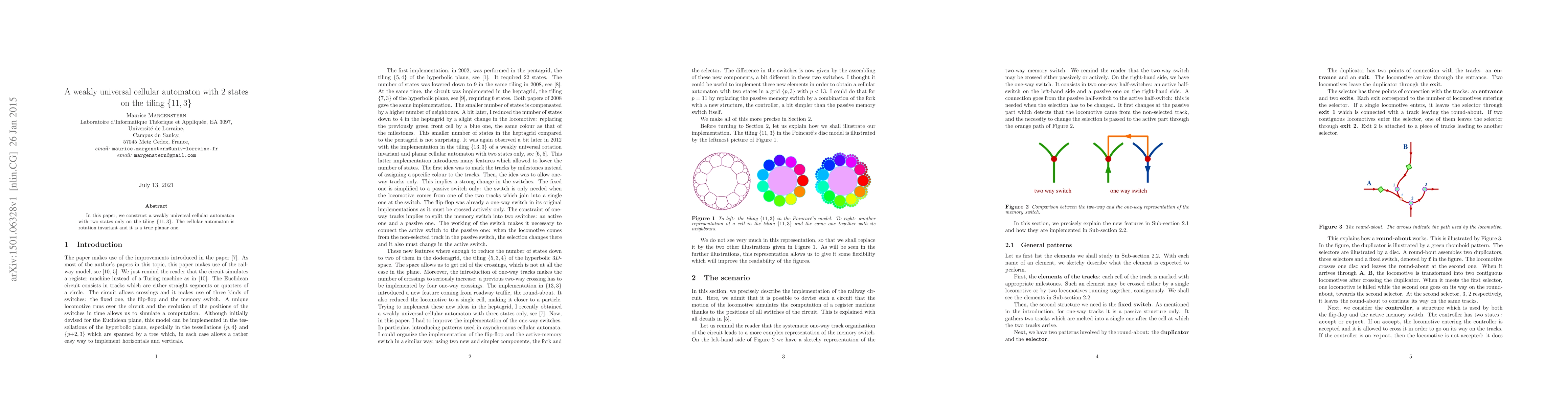 Summary: This paper presents a two-state cellular automaton on the {11,3} tiling that achieves weak universality, maintaining rotation invariance and planar characteristics. The construction demonstrates the potential of simple rules in complex computational processes.