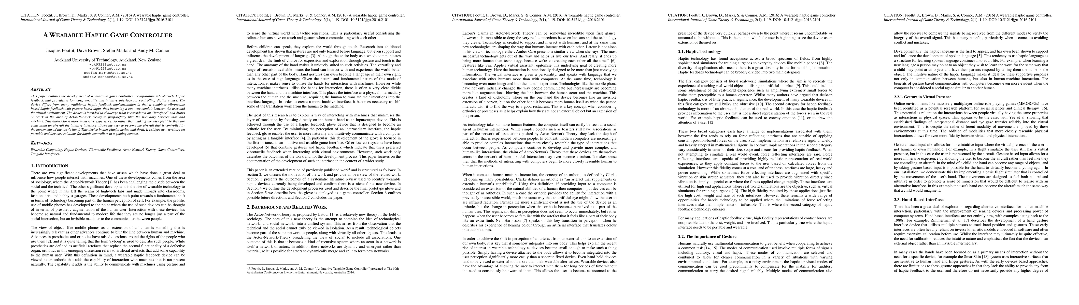 This paper outlines the development of a wearable game controller incorporating vibrotacticle haptic feedback that provides a low cost, versatile and intuitive interface for controlling digital games. The device differs from many traditional haptic feedback implementation in that it combines vibrotactile based haptic feedback with gesture based input, thus becoming a two way conduit between the user and the virtual environment. The device is intended to challenge what is considered an "interface" and draws on work in the area of Actor-Network theory to purposefully blur the boundary between man and machine. This allows for a more immersive experience, so rather than making the user feel like they are controlling an aircraft the intuitive interface allows the user to become the aircraft that is controlled by the movements of the user's hand. This device invites playful action and thrill. It bridges new territory on portable and low cost solutions for haptic controllers in a gaming context.