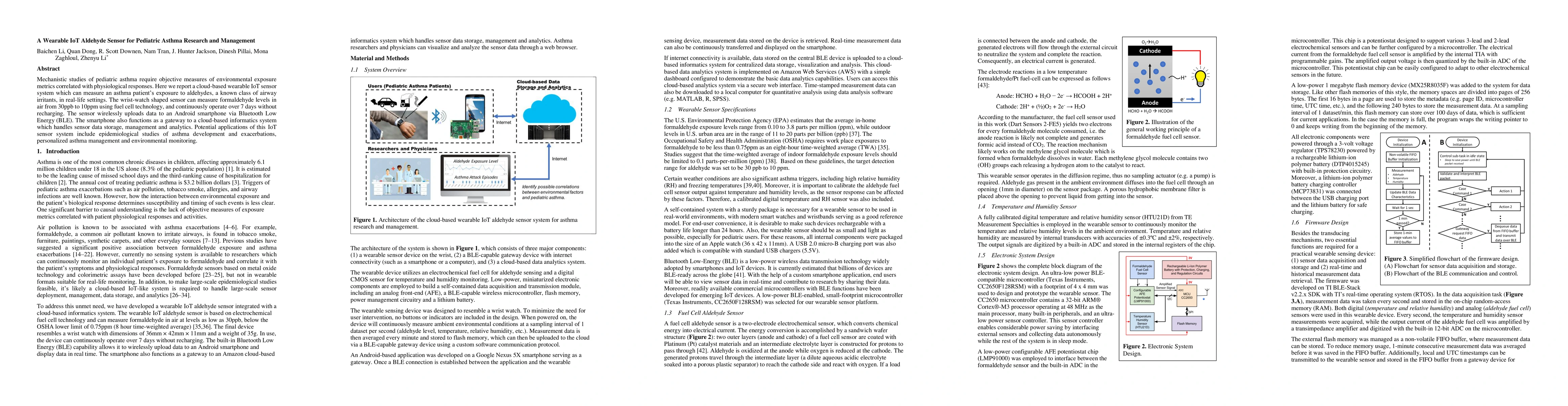 This paper presents a wearable IoT sensor system in a wrist-watch form to measure aldehyde exposure in pediatric asthma patients, using fuel cell technology for real-time monitoring over 7 days. Data collected via Bluetooth is transmitted to an AWS-based informatics system for analysis, aiming to enhance asthma research and management.