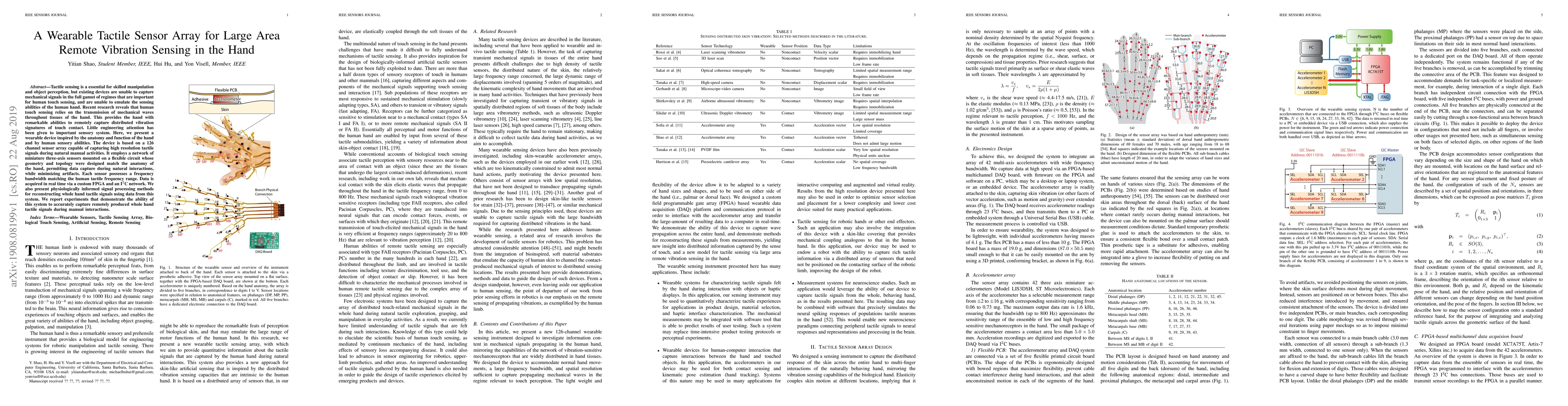 Tactile sensing is a essential for skilled manipulation and object perception, but existing devices are unable to capture mechanical signals in the full gamut of regimes that are important for human touch sensing, and are unable to emulate the sensing abilities of the human hand. Recent research reveals that human touch sensing relies on the transmission of mechanical waves throughout tissues of the hand. This provides the hand with remarkable abilities to remotely capture distributed vibration signatures of touch contact. Little engineering attention has been given to important sensory system. Here, we present a wearable device inspired by the anatomy and function of the hand and by human sensory abilities. The device is based on a 126 channel sensor array capable of capturing high resolution tactile signals during natural manual activities. It employs a network of miniature three-axis sensors mounted on a flexible circuit whose geometry and topology were designed match the anatomy of the hand, permitting data capture during natural interactions, while minimizing artifacts. Each sensor possesses a frequency bandwidth matching the human tactile frequency range. Data is acquired in real time via a custom FPGA and an I$^2$C network. We also present physiologically informed signal processing methods for reconstructing whole hand tactile signals using data from this system. We report experiments that demonstrate the ability of this system to accurately capture remotely produced whole hand tactile signals during manual interactions.