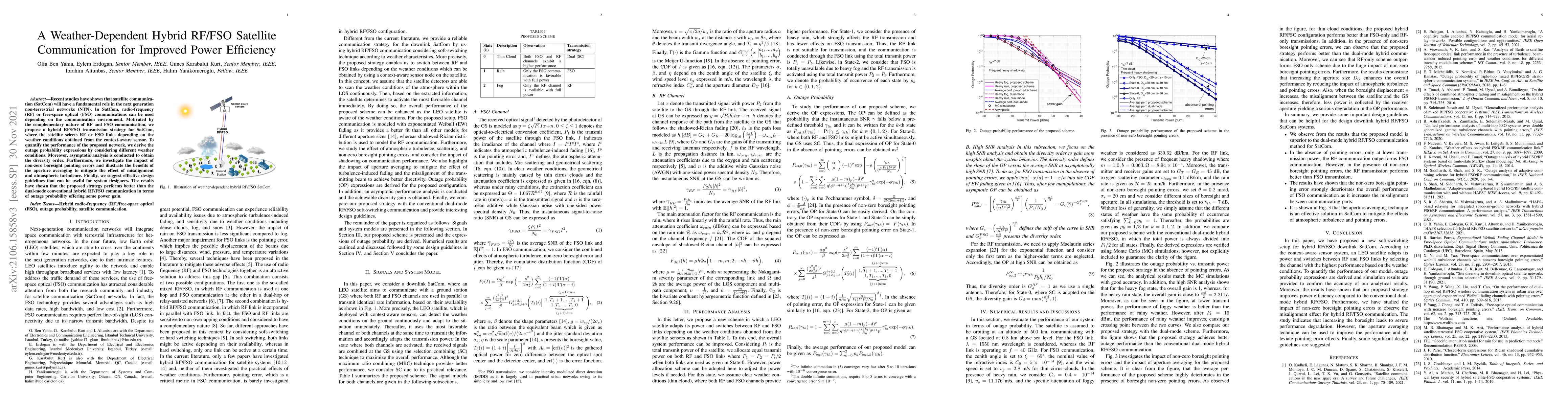This paper proposes a weather-dependent hybrid RF/FSO satellite communication strategy that dynamically selects RF or FSO links based on real-time weather data. The study shows that this approach outperforms traditional hybrid systems in terms of outage probability and power efficiency, while also addressing pointing errors and turbulence.