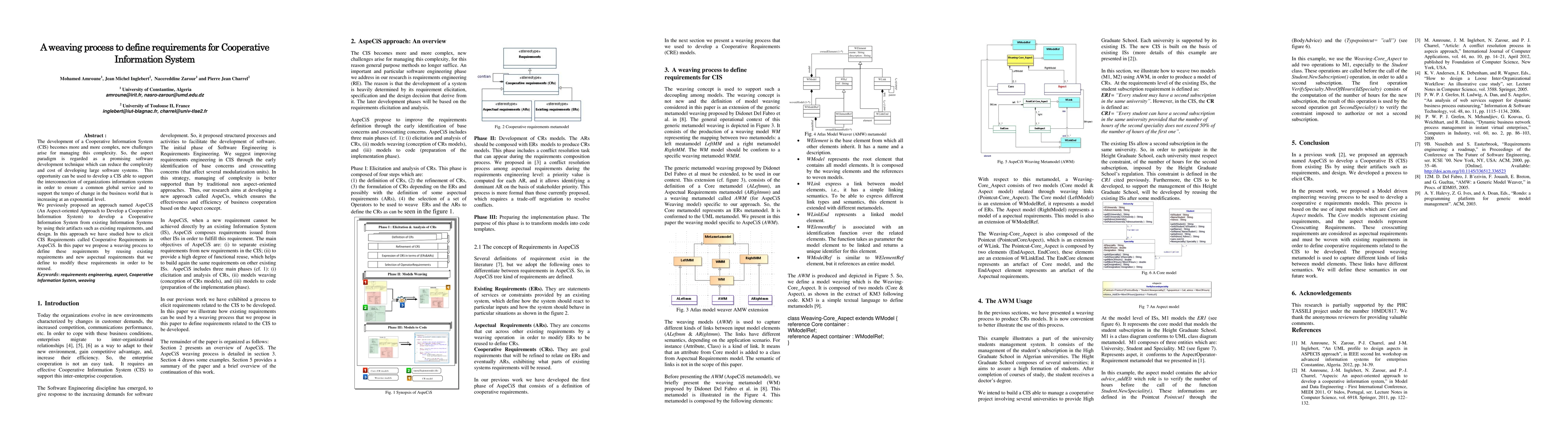 The development of a Cooperative Information System (CIS) becomes more and more complex, new challenges arise for managing this complexity. So, the aspect paradigm is regarded as a promising software development technique which can reduce the complexity and cost of developing large software systems. This opportunity can be used to develop a CIS able to support the interconnection of organizations information systems in order to ensure a common global service and to support the tempo of change in the business world that is increasing at an exponential level. We previously proposed an approach named AspeCiS (An Aspect-oriented Approach to Develop a Cooperative Information System) to develop a Cooperative Information System from existing Information Systems by using their artifacts such as existing requirements, and design. In this approach we have studied how to elicit CIS Requirements called Cooperative Requirements in AspeCiS. In this paper we propose a weaving process to define these requirements by reusing existing requirements and new aspectual requirements that we define to modify these requirements in order to be reused.