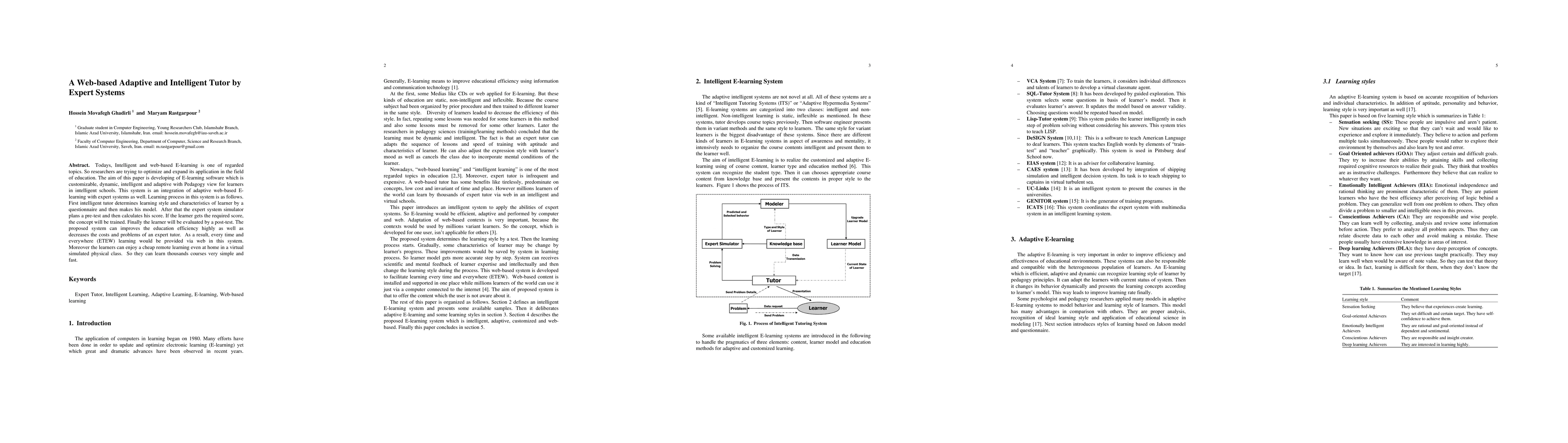 This paper develops an adaptive, intelligent, and customizable web-based E-learning tutor using expert systems that determines learner characteristics and optimizes the educational process through pre-tests and post-tests, ultimately aiming to enhance educational efficiency and reduce costs. The system enables ETEW learning, providing affordable remote education anytime and anywhere.