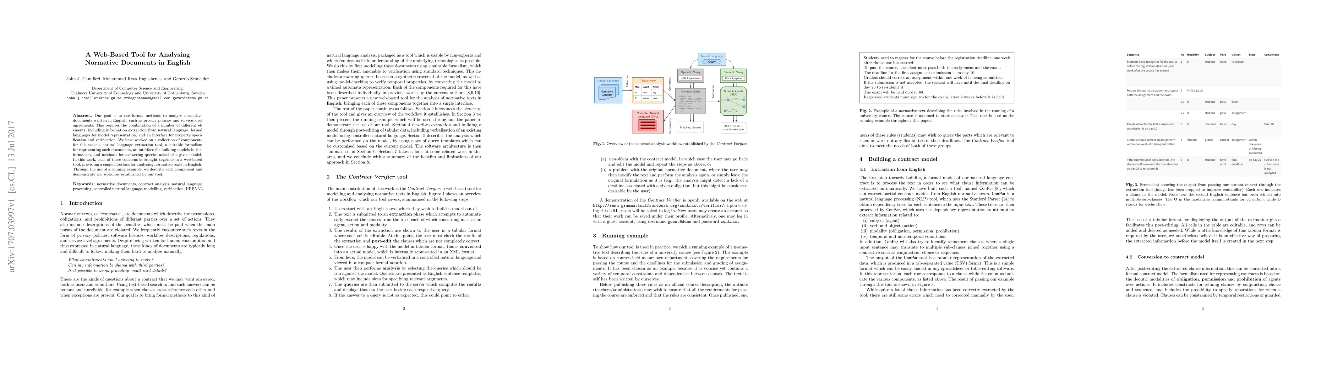 Our goal is to use formal methods to analyse normative documents written in English, such as privacy policies and service-level agreements. This requires the combination of a number of different elements, including information extraction from natural language, formal languages for model representation, and an interface for property specification and verification. We have worked on a collection of components for this task: a natural language extraction tool, a suitable formalism for representing such documents, an interface for building models in this formalism, and methods for answering queries asked of a given model. In this work, each of these concerns is brought together in a web-based tool, providing a single interface for analysing normative texts in English. Through the use of a running example, we describe each component and demonstrate the workflow established by our tool.
