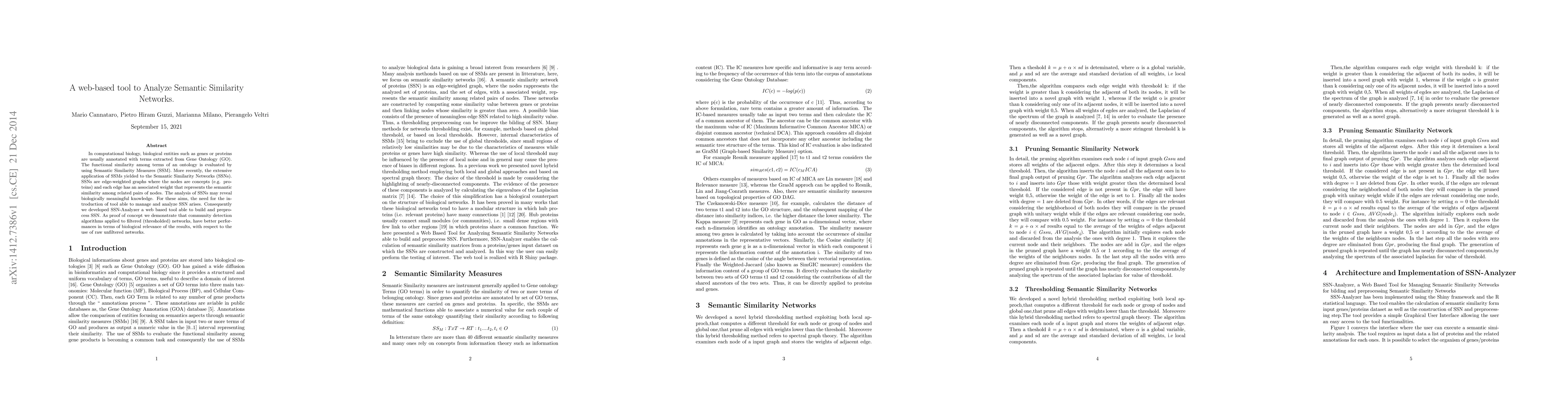 In computational biology, biological entities such as genes or proteins are usually annotated with terms extracted from Gene Ontology (GO). The functional similarity among terms of an ontology is evaluated by using Semantic Similarity Measures (SSM). More recently, the extensive application of SSMs yielded to the Semantic Similarity Networks (SSNs). SSNs are edge-weighted graphs where the nodes are concepts (e.g. proteins) and each edge has an associated weight that represents the semantic similarity among related pairs of nodes. The analysis of SSNs may reveal biologically meaningful knowledge. For these aims, the need for the introduction of tool able to manage and analyze SSN arises. Consequently we developed SSN-Analyzer a web based tool able to build and preprocess SSN. As proof of concept we demonstrate that community detection algorithms applied to filtered (thresholded) networks, have better performances in terms of biological relevance of the results, with respect to the use of raw unfiltered networks.