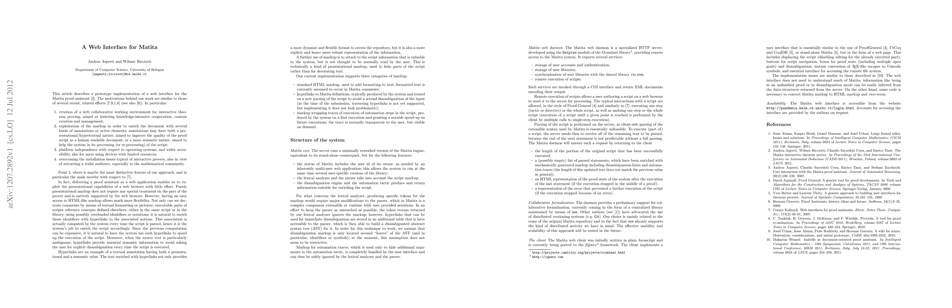 A web interface for Matita was developed using HTML, CSS, and JavaScript.