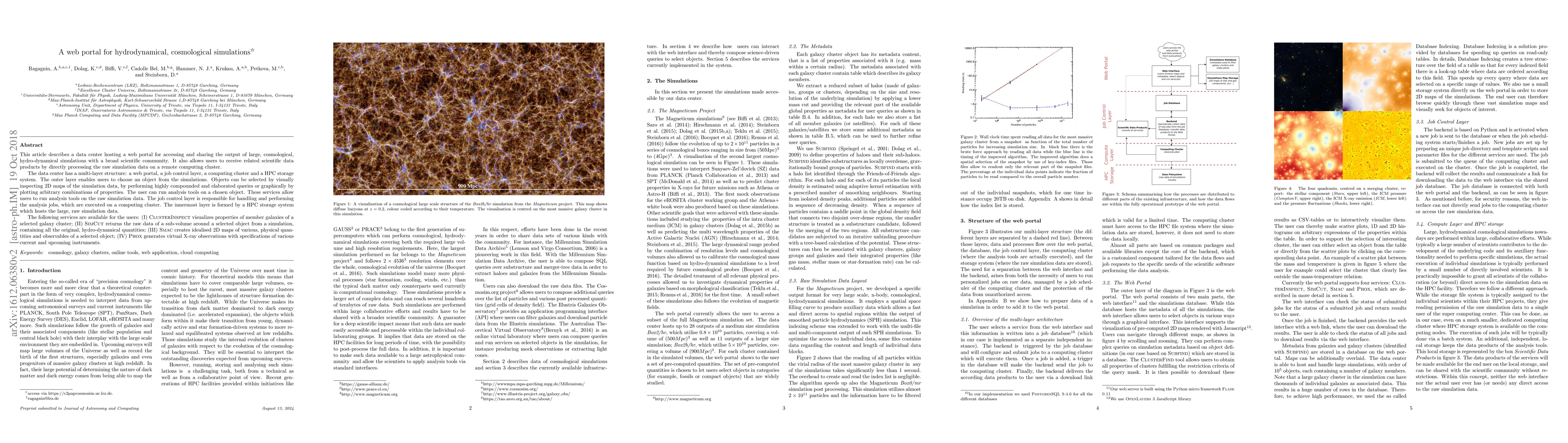 This article describes a data center hosting a web portal for accessing and sharing the output of large, cosmological, hydro-dynamical simulations with a broad scientific community. It also allows users to receive related scientific data products by directly processing the raw simulation data on a remote computing cluster. The data center has a multi-layer structure: a web portal, a job control layer, a computing cluster and a HPC storage system. The outer layer enables users to choose an object from the simulations. Objects can be selected by visually inspecting 2D maps of the simulation data, by performing highly compounded and elaborated queries or graphically by plotting arbitrary combinations of properties. The user can run analysis tools on a chosen object. These services allow users to run analysis tools on the raw simulation data. The job control layer is responsible for handling and performing the analysis jobs, which are executed on a computing cluster. The innermost layer is formed by a HPC storage system which hosts the large, raw simulation data. The following services are available for the users: (I) {\sc ClusterInspect} visualizes properties of member galaxies of a selected galaxy cluster; (II) {\sc SimCut} returns the raw data of a sub-volume around a selected object from a simulation, containing all the original, hydro-dynamical quantities; (III) {\sc Smac} creates idealised 2D maps of various, physical quantities and observables of a selected object; (IV) {\sc Phox} generates virtual X-ray observations with specifications of various current and upcoming instruments.