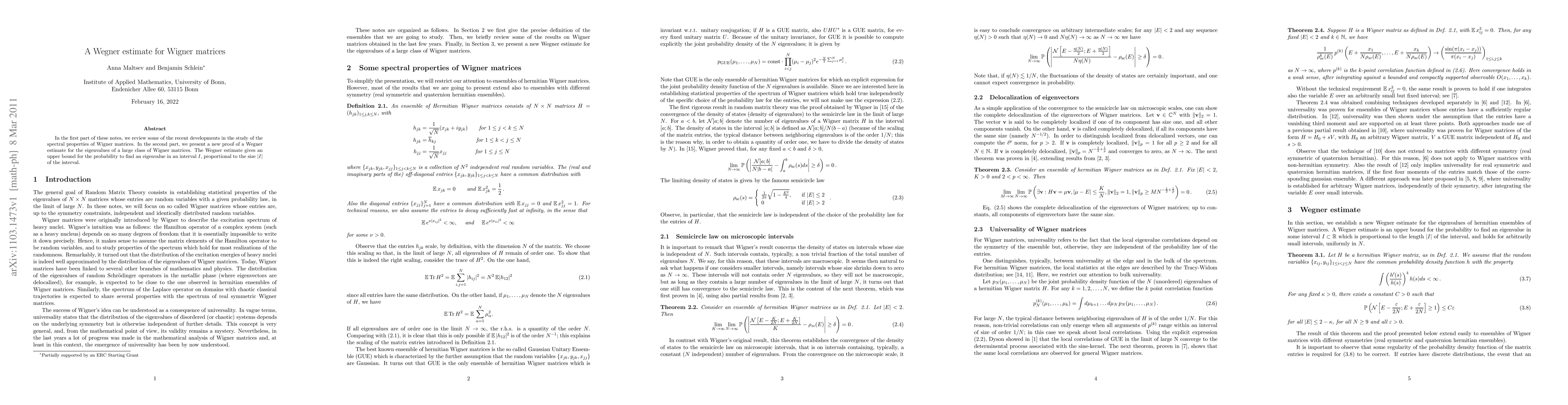 In the first part of these notes, we review some of the recent developments in the study of the spectral properties of Wigner matrices. In the second part, we present a new proof of a Wegner estimate for the eigenvalues of a large class of Wigner matrices. The Wegner estimate gives an upper bound for the probability to find an eigenvalue in an interval $I$, proportional to the size $|I|$ of the interval.