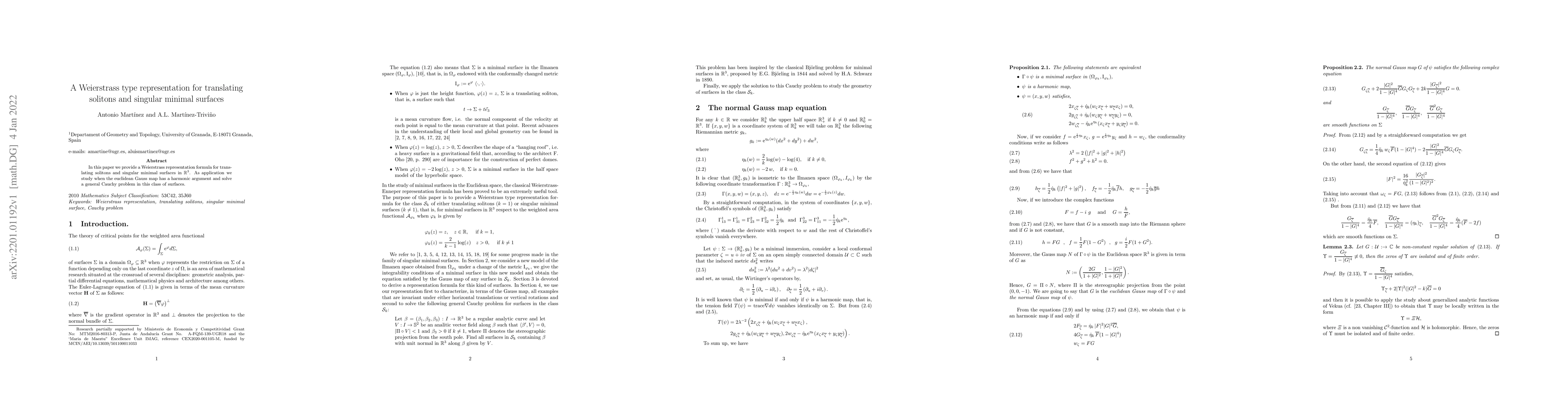 This paper presents a Weierstrass representation for translating solitons and singular minimal surfaces in ${\mathbb{R}^3}$, and explores conditions under which the Euclidean Gauss map has a harmonic argument, solving a general Cauchy problem for these surfaces.