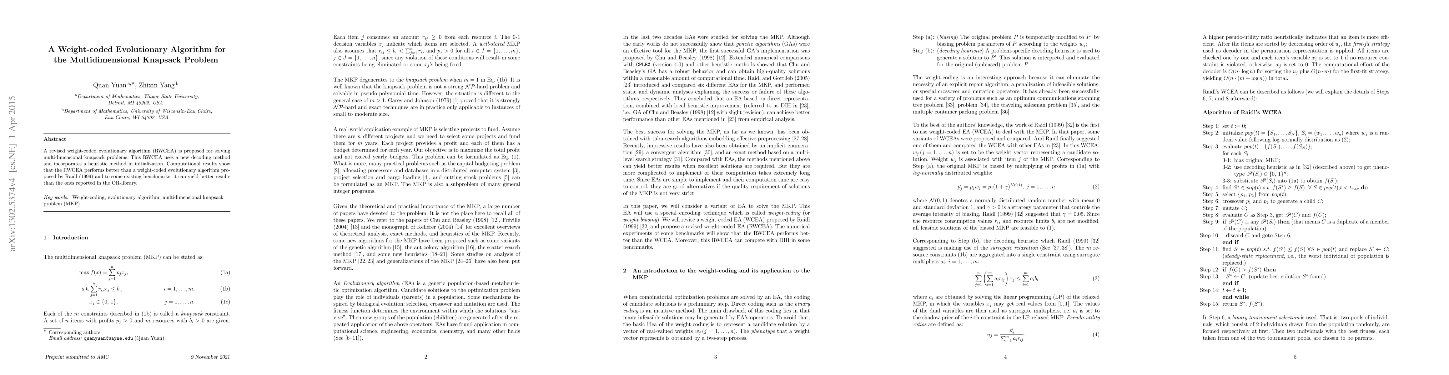 Summary: This paper proposes a revised weight-coded evolutionary algorithm (RWCEA) for solving multidimensional knapsack problems, featuring a new decoding method and heuristic initialization. Computational results indicate that RWCEA outperforms previous algorithms, including those from the OR-library.