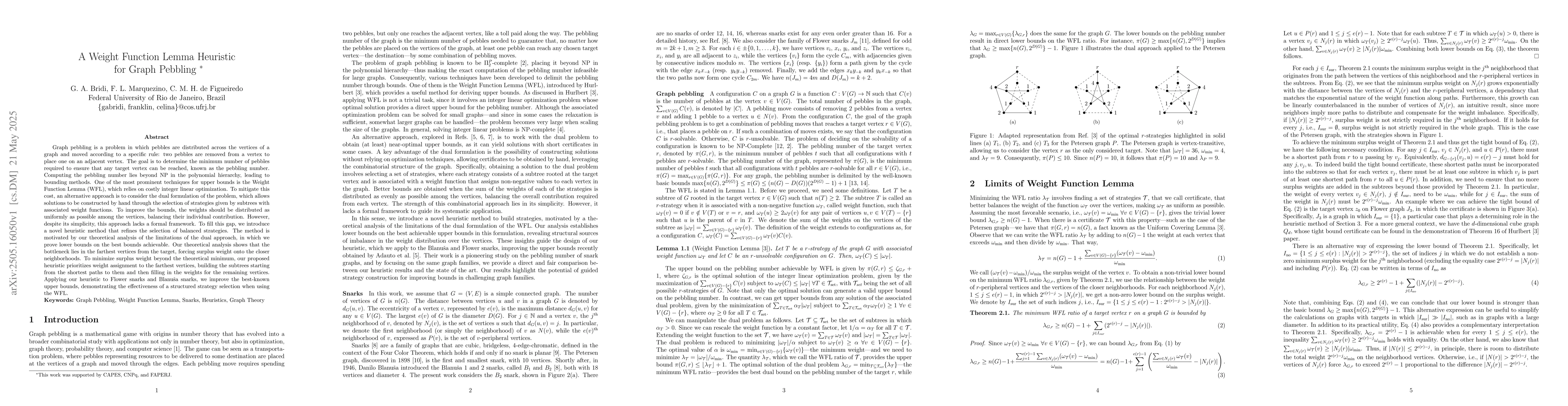 The paper introduces a heuristic method to refine the selection of balanced strategies for the Weight Function Lemma (WFL) in graph pebbling, focusing on distributing weights uniformly among vertices and minimizing surplus weight.