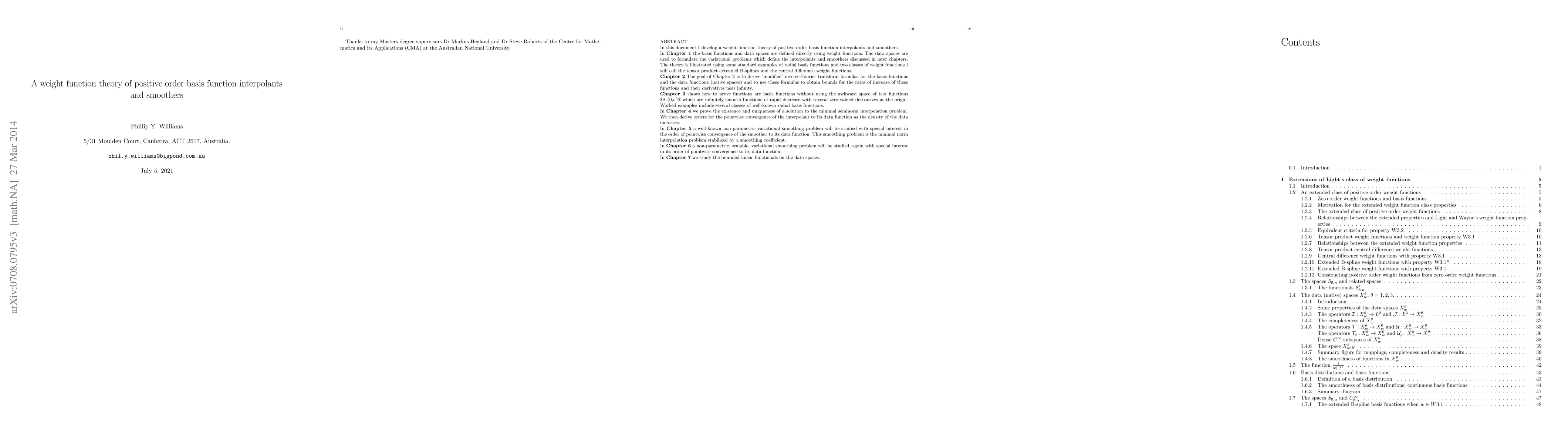 In this document I develop a weight function theory of positive order basis function interpolants and smoothers. **In Chapter 1 the basis functions and data spaces are defined directly using weight functions. The data spaces are used to formulate the variational problems which define the interpolants and smoothers discussed in later chapters. The theory is illustrated using some standard examples of radial basis functions and two classes of weight functions I will call the tensor product extended B-splines and the central difference weight functions. **In Chapter 2 I derive modified inverse-Fourier transform formulas for the basis functions and the data functions (native spaces) and to use these formulas to obtain bounds for the rates of increase of these functions and their derivatives near infinity. **Chapter 3 shows how to prove functions are basis functions without using the awkward space of test functions $S_{0,n}$ which are infinitely smooth functions of rapid decrease with several zero-valued derivatives at the origin. Worked examples include several classes of well-known radial basis functions. **In Chapter 4 we prove the existence and uniqueness of a solution to the minimal seminorm interpolation problem. We then derive orders for the pointwise convergence of the interpolant to its data function as the density of the data increases. **In Chapter 5 a well-known non-parametric variational smoothing problem will be studied with special interest in the order of pointwise convergence of the smoother to its data function. This smoothing problem is the minimal norm interpolation problem stabilized by a smoothing coefficient. **In Chapter 6 a non-parametric, scalable, variational smoothing problem will be studied, with special interest in its order of pointwise convergence to its data function. **In Chapter 7 we study the bounded linear functionals on the data spaces.
