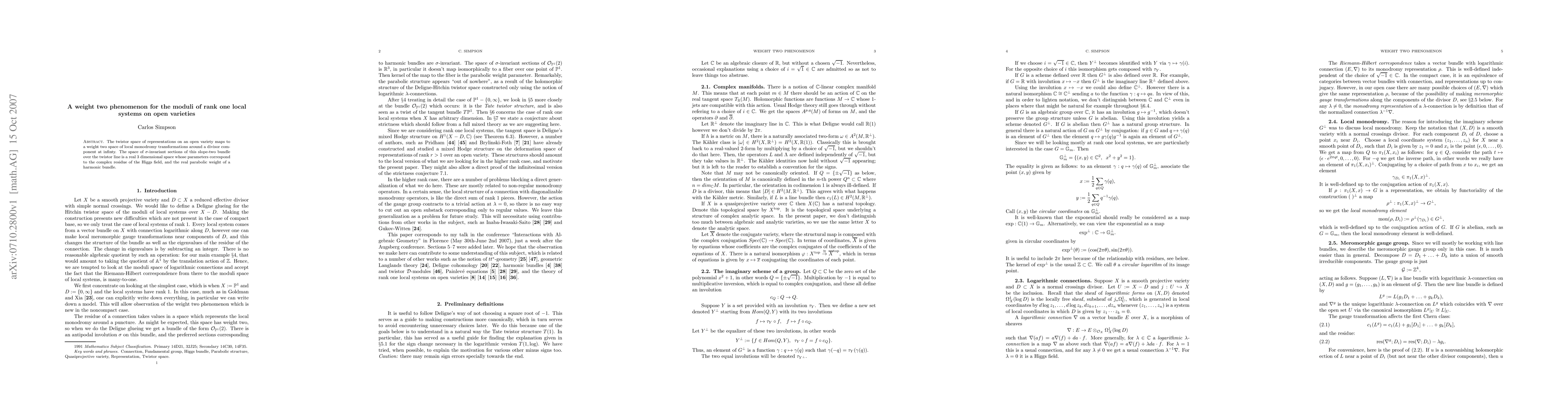 The twistor space of representations on an open variety maps to a weight two space of local monodromy transformations around a divisor component at infinty. The space of $\sigma$-invariant sections of this slope-two bundle over the twistor line is a real 3 dimensional space whose parameters correspond to the complex residue of the Higgs field, and the real parabolic weight of a harmonic bundle.